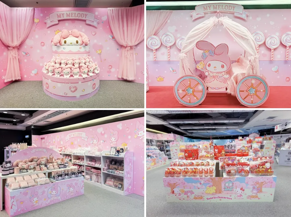 -亮点:6 大粉红打卡位(华丽马车 Melody、毛公仔蛋糕塔、樱花新春区等)+ 限定周边(贝雷帽公仔钥匙扣、梦幻仙境系列等)