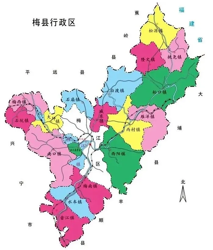 梅县区辖1个街道、18个镇:新城街道、城东镇、石扇镇、梅西镇、大坪镇、石坑镇、水车镇、梅南镇、丙村镇、白渡镇、松源镇、隆文镇、桃尧镇、畲江镇、雁洋镇、松口镇、南口镇、程江镇、扶大镇,另辖1个乡级单位:梅西水库。区政府驻程江镇宪梓南路。