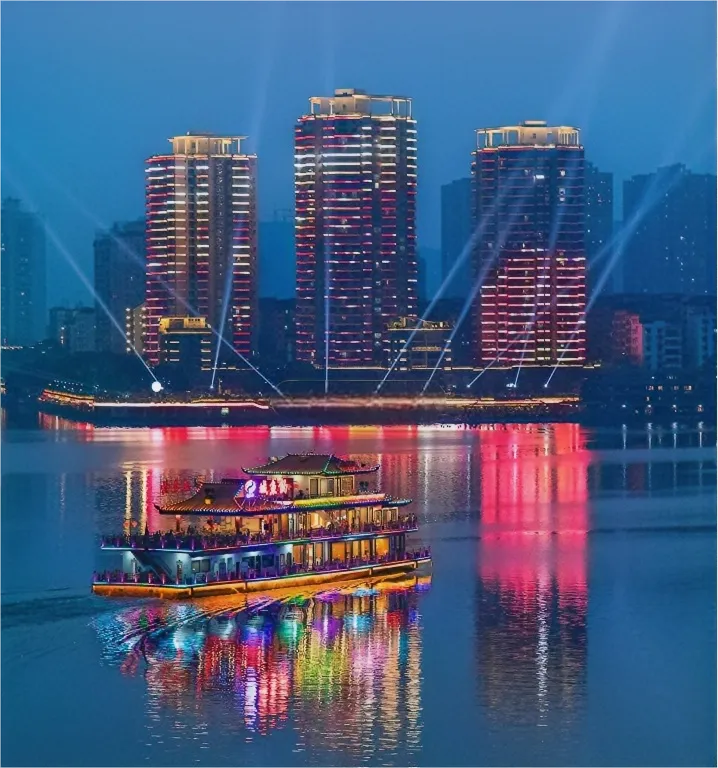 “钓鱼城号”游轮推出宋韵“三江夜宴”,以合川三江文化、巴渝历史为魂,融合宋代风格游船,将“夜游三江”与“宫廷御宴”结合,打造古韵歌舞、乐曲、诗词与美食一体的沉浸式体验。夜幕下,嘉陵江、涪江两岸霓虹璀璨,景点灯彩点缀,三江夜景与宋韵宴饮相衬,成就合川“江上宋味”文旅体验。