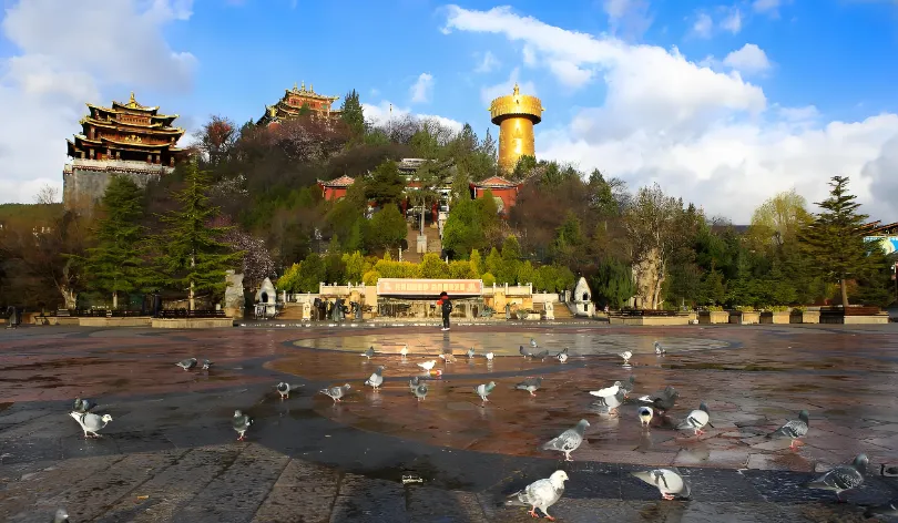 第八站:龟山公园独克宗古城制高点,世界最大转经筒需12人合力转动。傍晚登顶可俯瞰古城全貌,月光广场跳锅庄舞体验藏族风情。转经筒顺时针转3圈可祈福,勿踩踏经幡。