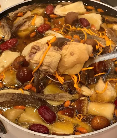 第三美食:松茸炖鸡“普达措松茸走廊”限定美食,7-9月雨季野生松茸与土鸡慢炖,汤鲜味美。采茸人世代守规,菌片蜷成小金卷,咬开时鲜甜气直窜天灵盖。