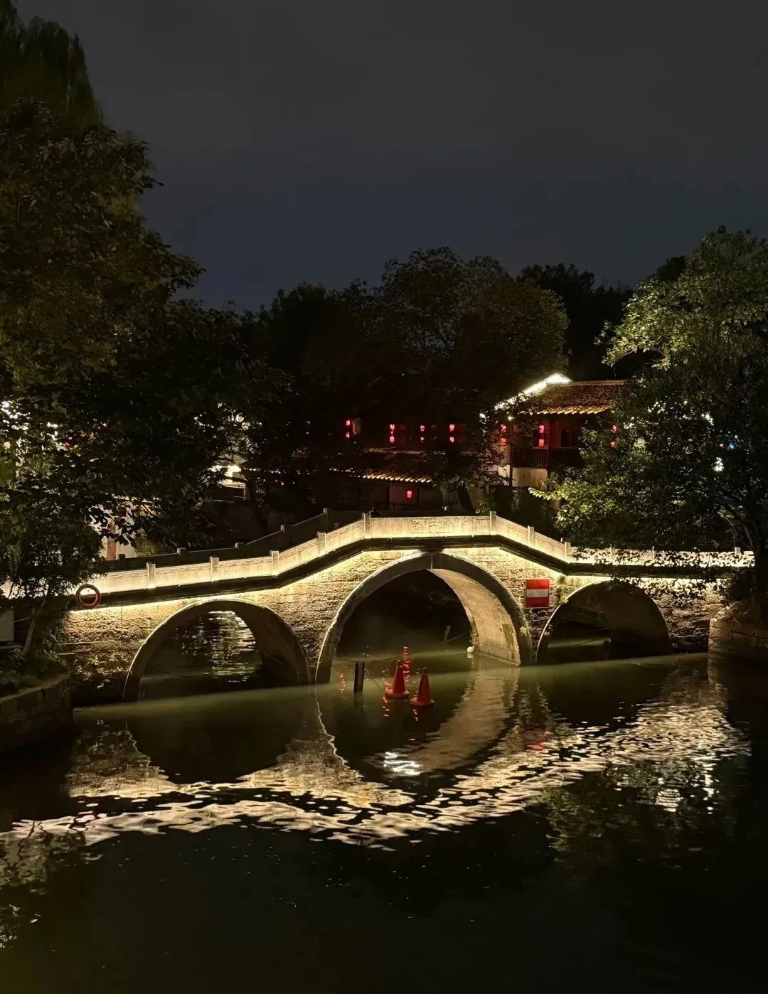 运河边客栈晚上吹风,桥洞回声好听,拍夜景不用修图。