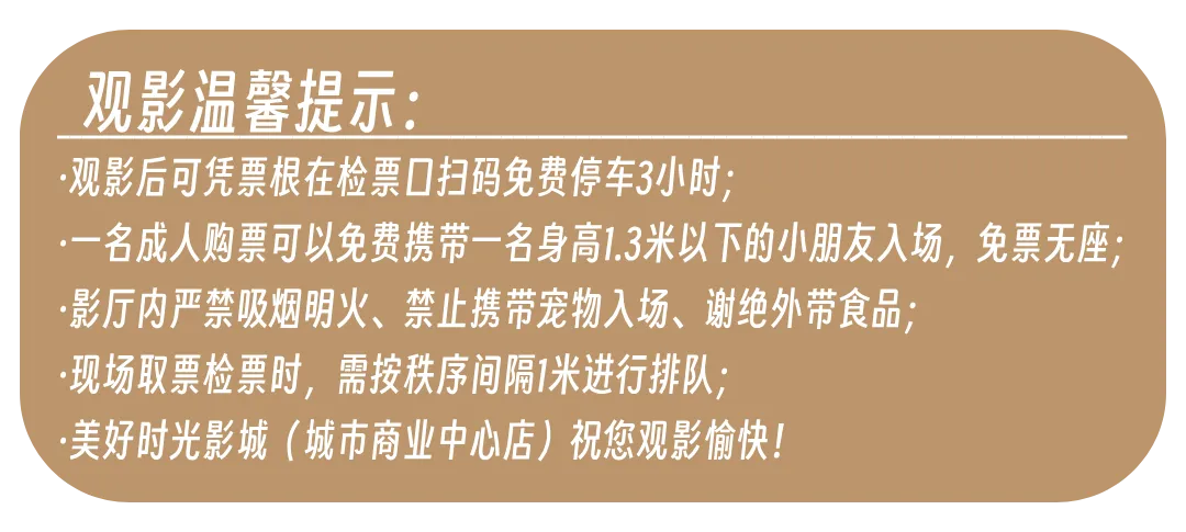 3、旅游年卡不支持线上选座,如需观影请提前半小时前往美好时光影城前台核销出票;高峰期人流量较大请尽早前往影城核销,给您带来不便敬请谅解