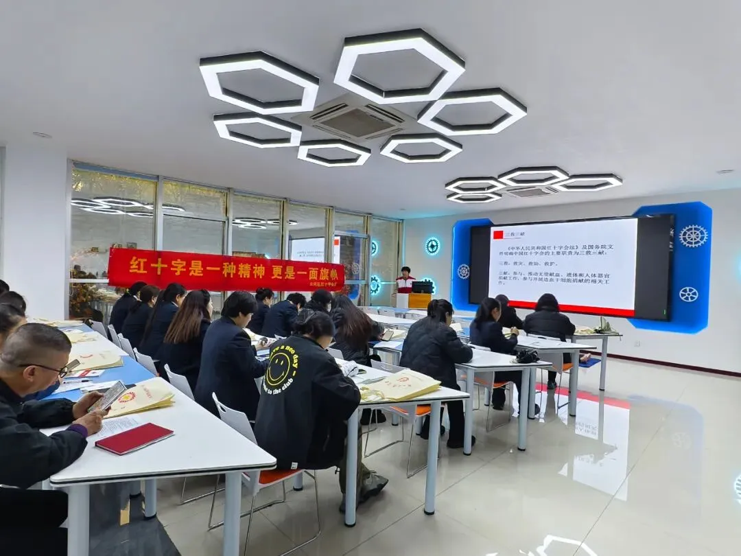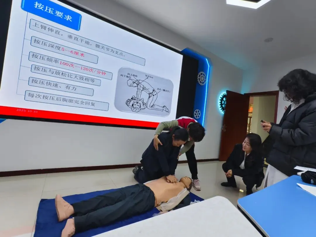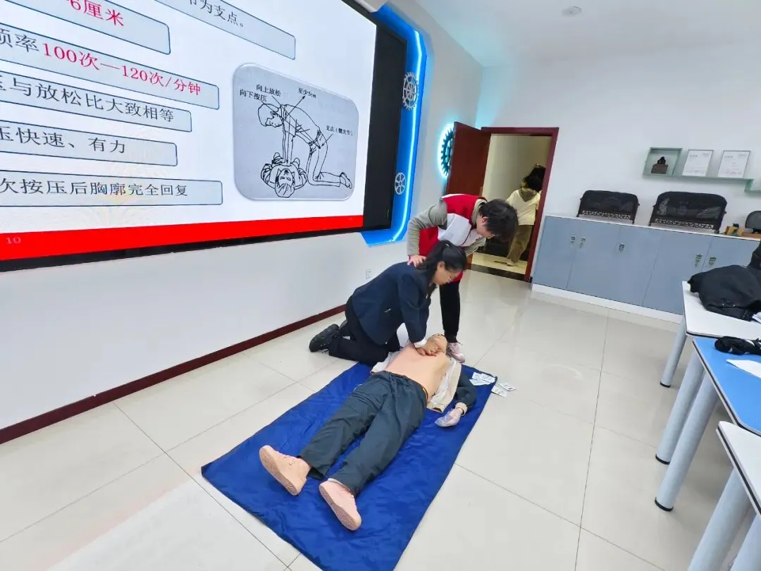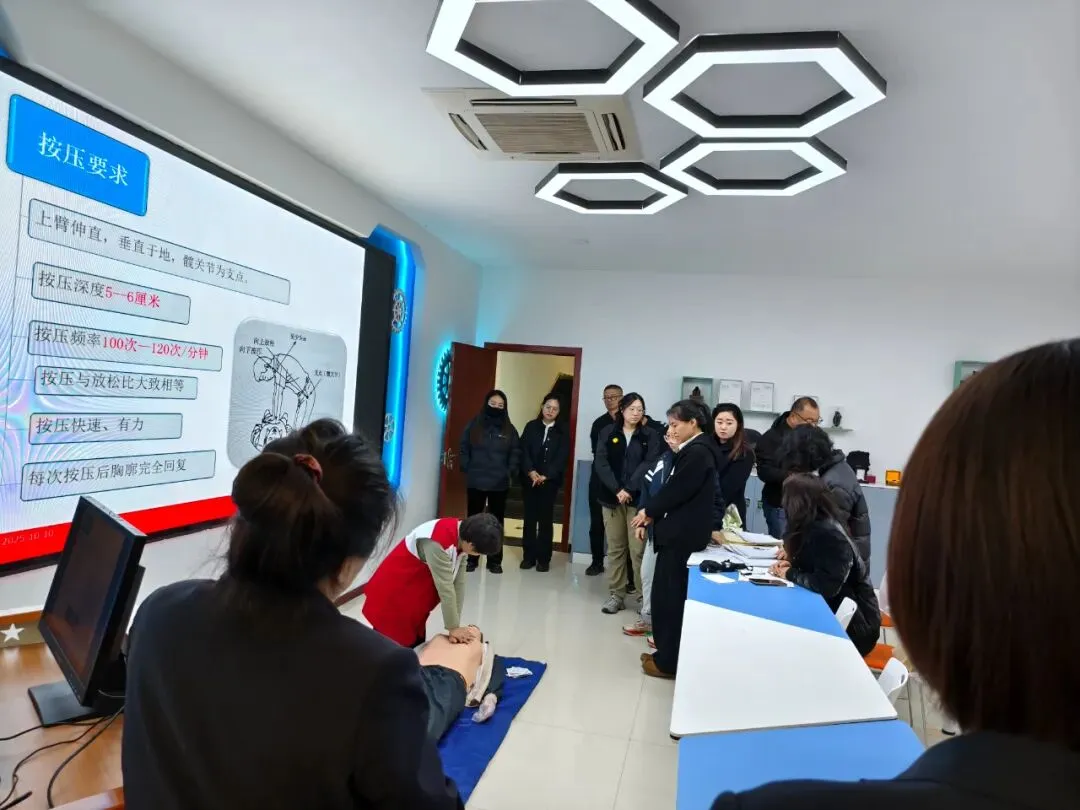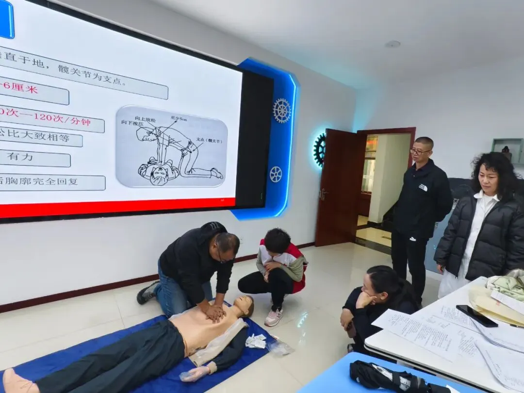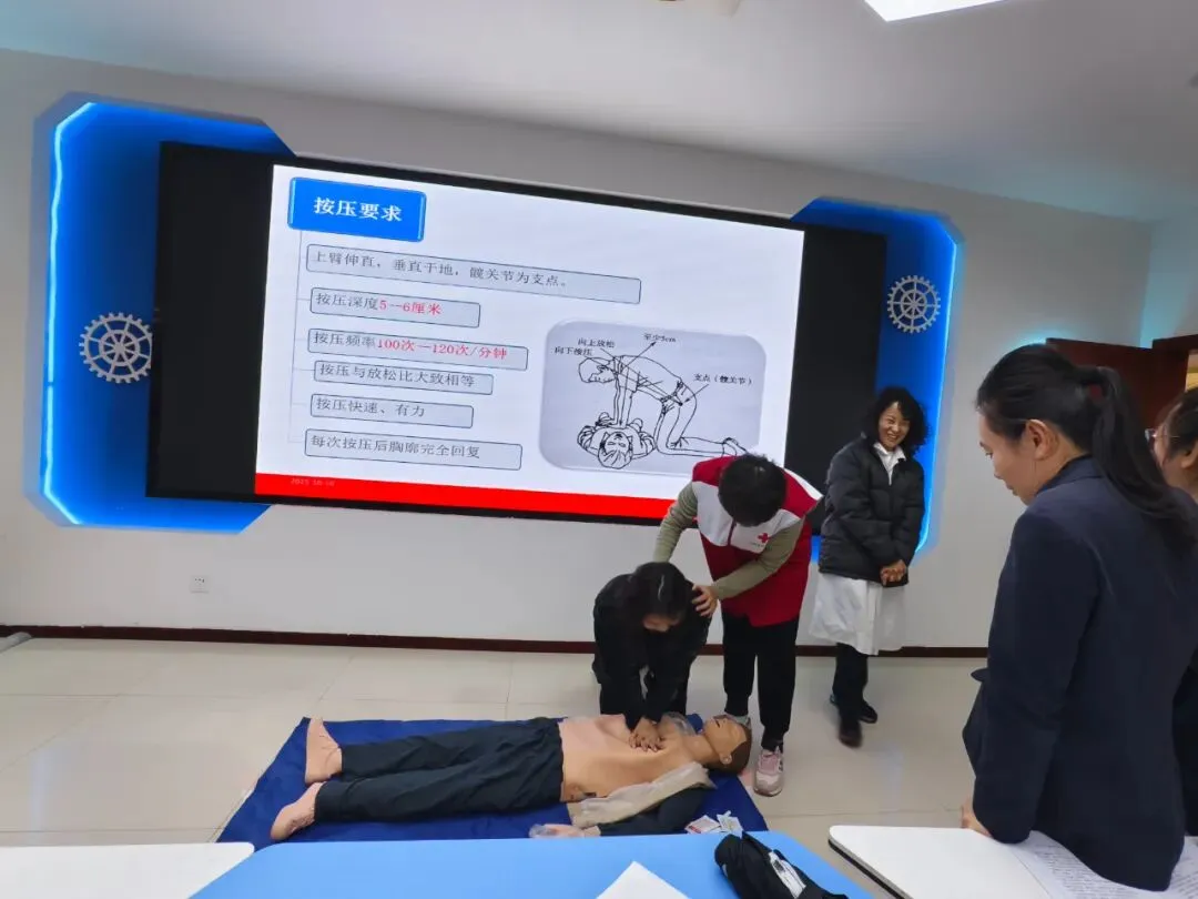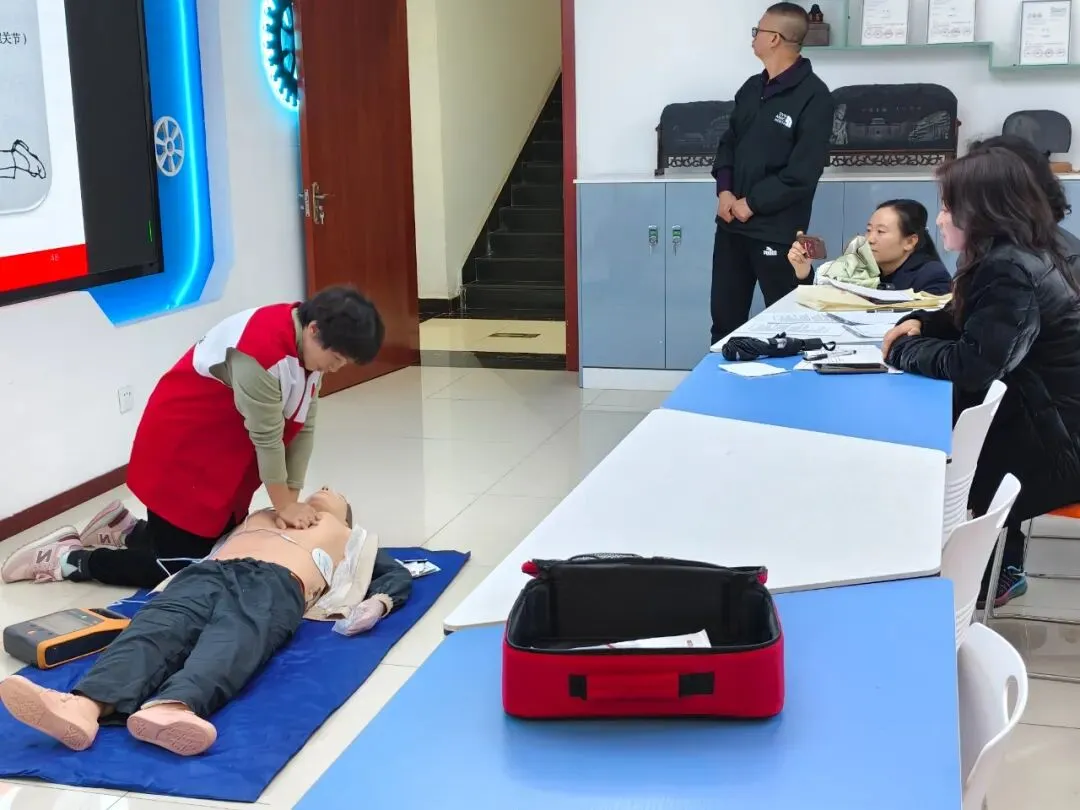 培训采用“理论讲解+实操演练”的模式。理论环节,讲师宣传《红十字法》后,为大家详细讲解心肺复苏、AED使用方法等理论知识;实操环节,讲师利用人体模型、模拟AED等教具进行示范教学,将胸外按压的深度与频率、人工呼吸的正确姿势等操作要领,逐一拆解动作细节。