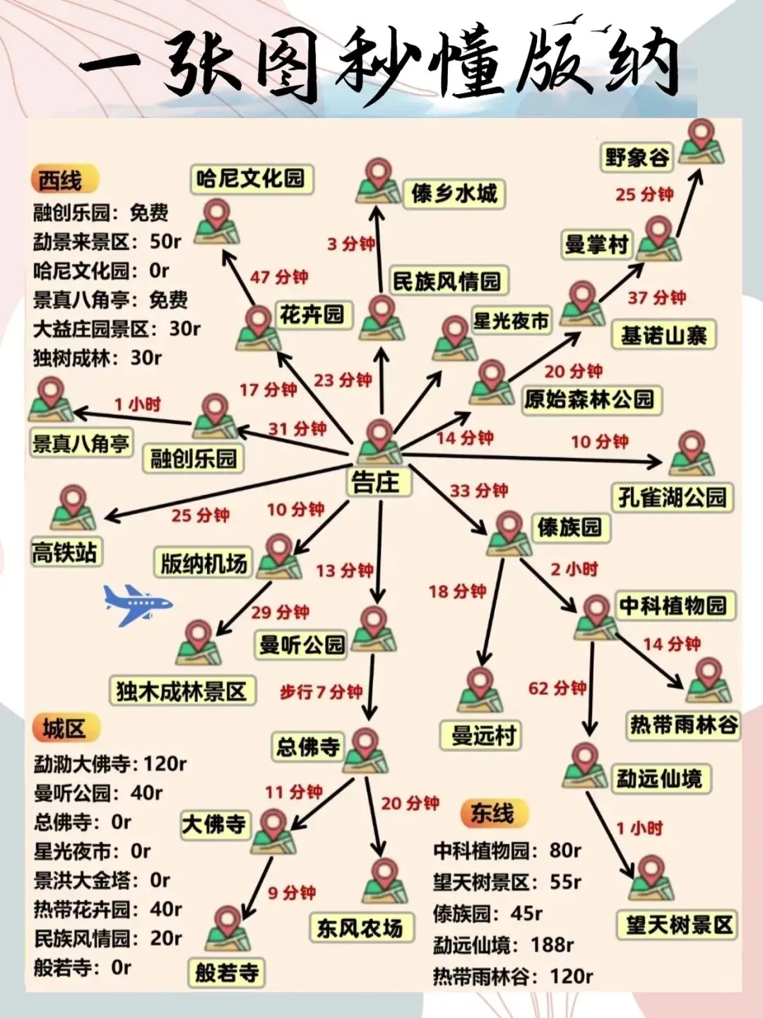 (附路线图:西双版纳站→嘎庄双西景→野象谷→原始森林公园→基诺山寨→傣族园→勐泐大佛寺→曼听公园→嘎洒机场)