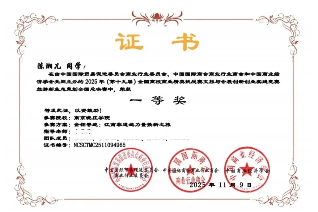 在专业实践竞赛中,她凭借扎实的调研能力与创新思维,斩获全国商业精英挑战赛江苏省省赛旅游项目调研一等奖、策划二等奖并顺利入围国赛;同时,她注重专业资质提升,先后取得全国计算机一级证书、普通话水平测试二级乙等证书、全国大学生英语四级证书、导游资格证书、中华人民共和国导游证及红十字会救护员证,以全面自主为实践赋能,展现了新时代大学生 “笃行实干” 的实践品格。