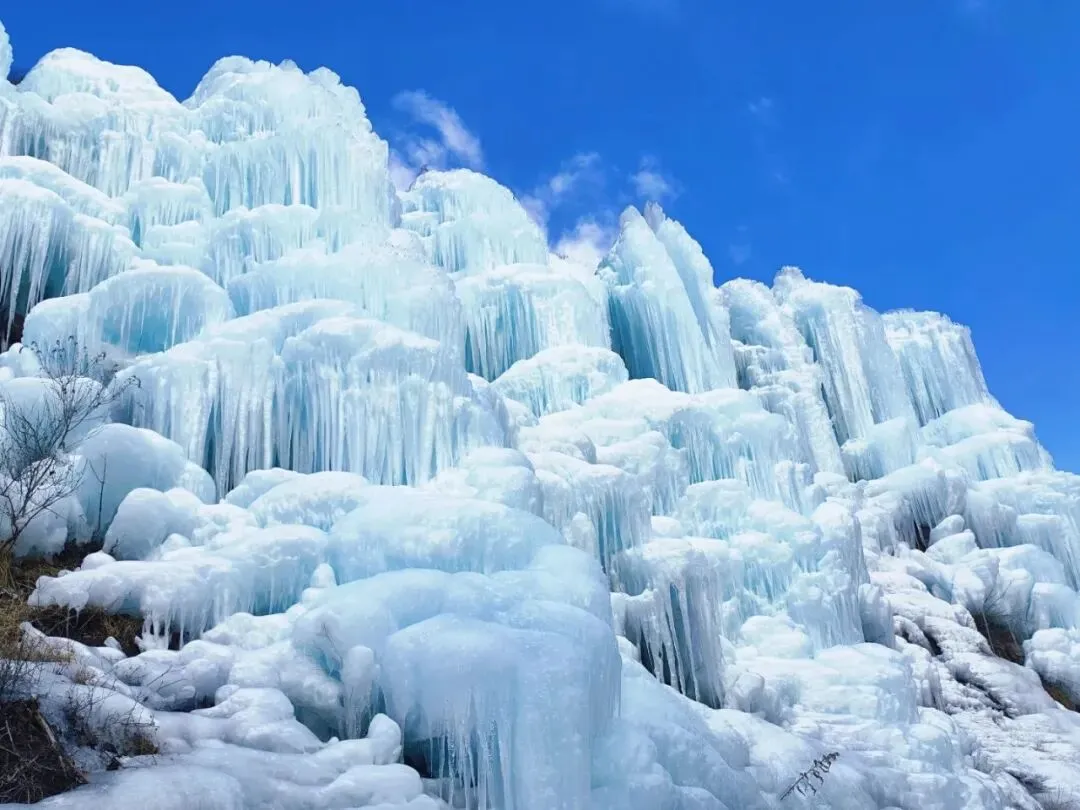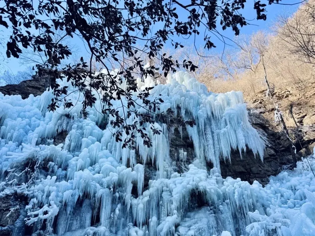 踏入虎峪,仿佛步入一个晶莹剔透的世界,沿着蜿蜒的山路前行,可以欣赏到8处、总面积2万余平方米的冰瀑景观,每一处都各不相同。巨大的冰瀑如同雄浑壮阔的立体画卷,从山间高悬而下,气势磅礴。冰柱层层叠叠,粗细不一,在阳光下闪烁着蓝白相间的光芒,宛如被大自然精心雕琢的水晶。