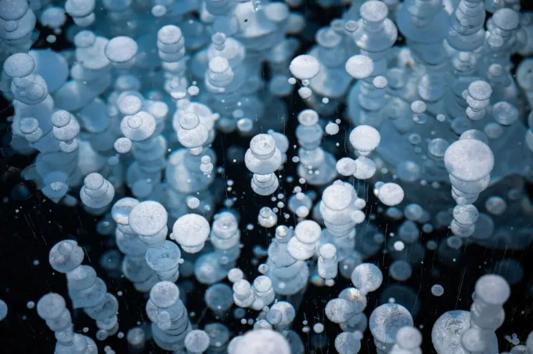 景区内梦幻的“气泡冰”更是不可错过的冬日美景,湖面冻结成冰,因背靠山阴,冰湖湛蓝而深邃,串串珍珠似的气泡定格在冰层之中,颇有“大珠小珠落玉盘”的画面感,十分唯美。