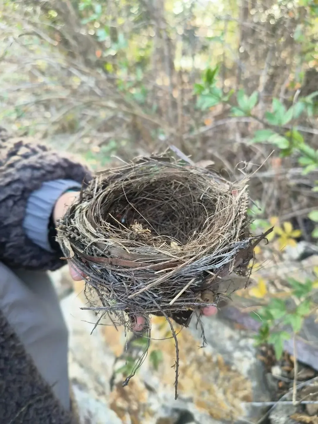 转角处的灌木丛旁,一场意外的惊喜在等待。那是一个杯状的小鸟窝,已经从树上掉落下来,静静躺在落叶堆里。它由细草和软枝细细编织而成,圆润的杯状轮廓,恰到好处的弧度,像一件精致的天然艺术品。我们屏住呼吸,轻轻拾起,仿佛能看见鸟儿曾在这里栖息、鸣叫的模样。孩子捧着鸟窝,眼睛亮晶晶的:“我们把它带回家吧,好好保存起来!”于是,我们将这枚自然的馈赠细心收好,让它带着东湖的草木气息,成为最特别的纪念。