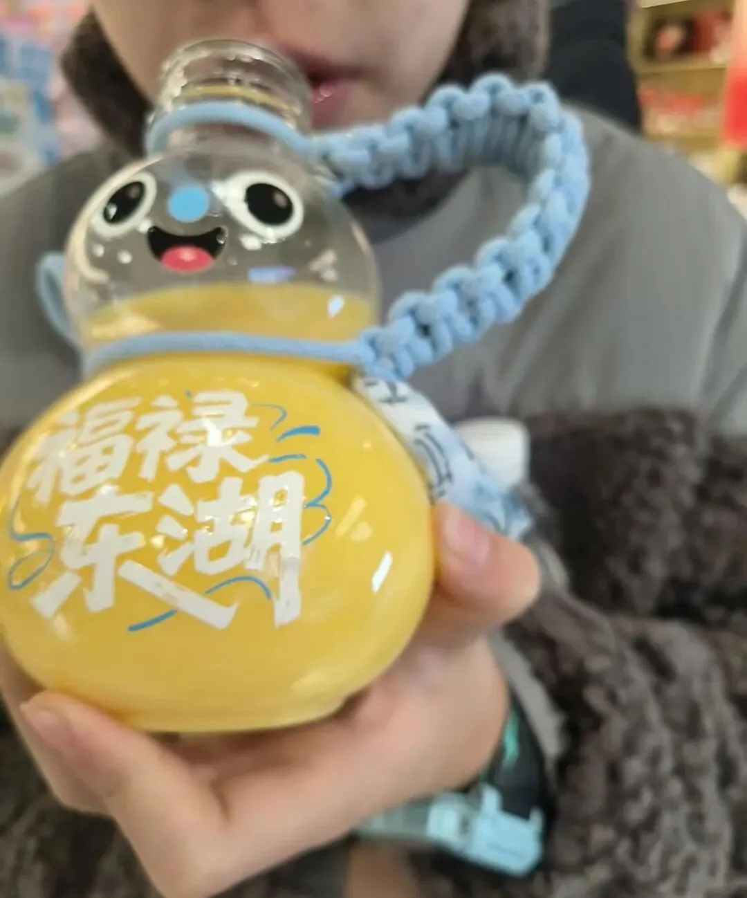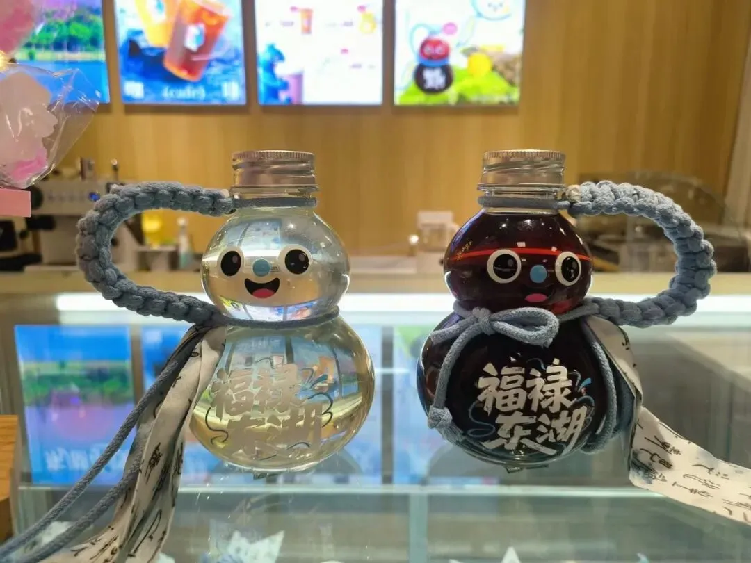 在磨山南门的文创商店里,我们看到了各种精美设计的挂件,冰箱贴,发钗,扇子之类的小玩意。让我们眼前一亮的是“福禄东湖”水壶,后来还看到9.9一瓶的饮料也是葫芦瓶装的,就立即买了一瓶给孩子尝尝。