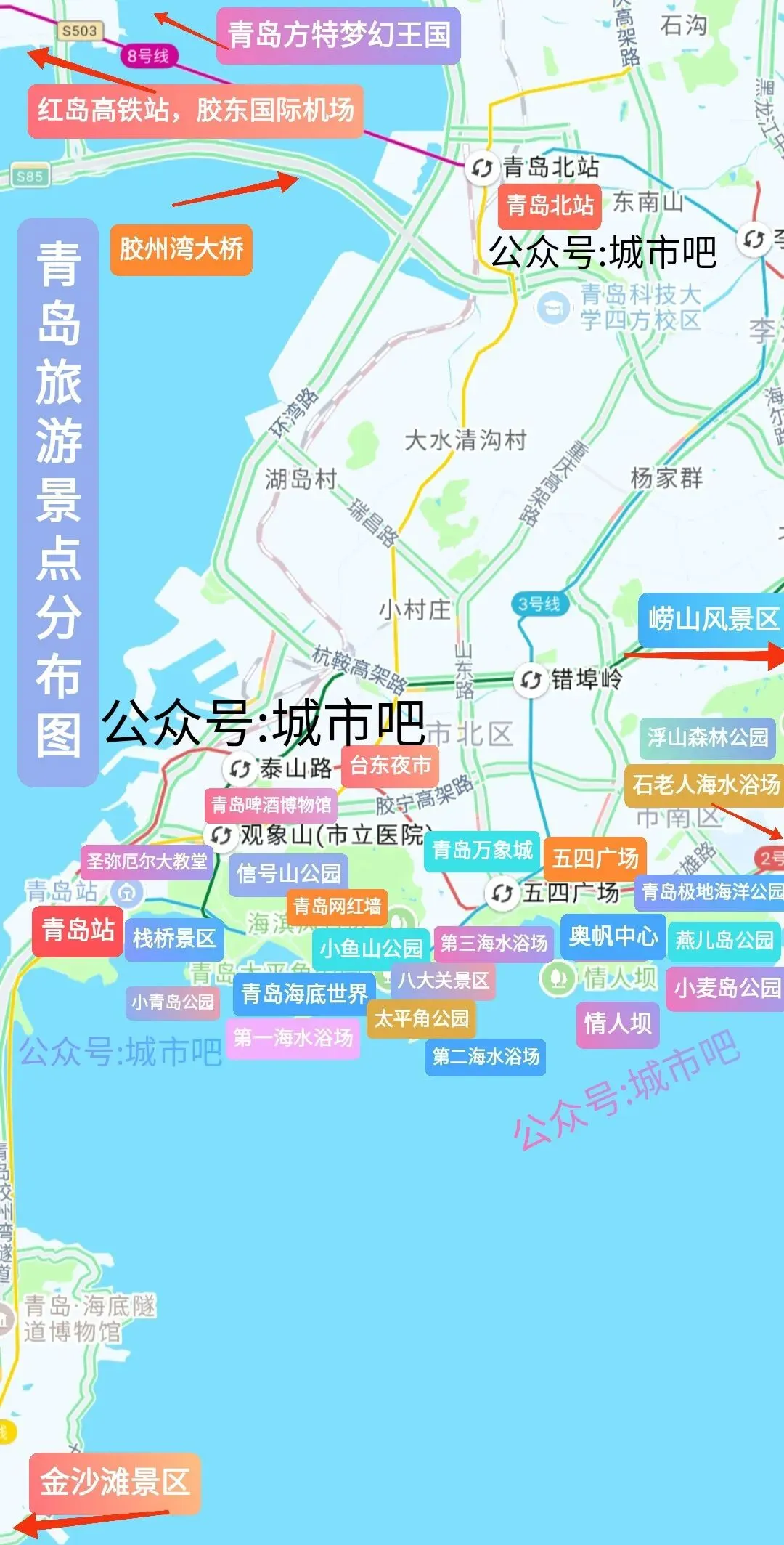 高铁:青岛站(首选!出站步行10分钟到栈桥),次选青岛北站→地铁3号线直达青岛站(30分钟,票价4元) 尽量别选青岛西站(无地铁直达,离市区较远),除非是去金沙滩景区游玩。