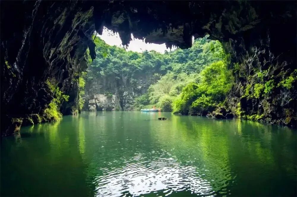 这里自然景观独特,融合了天坑溶洞、高峡平湖、石山土岭、湖泊溪谷等奇秀幽异的元素。景区内有高达几百米的天然迎宾石门,两侧山壁平整,十分壮观。地下暗河一水穿三坑,形成上、中、下三个巨大的石门,其中下洞的溶洞中遍布形态各异的钟乳石,在灯光照耀下绚丽多彩。游客还可乘坐游船穿梭于暗河之上,欣赏两岸的崇峰峻岭。