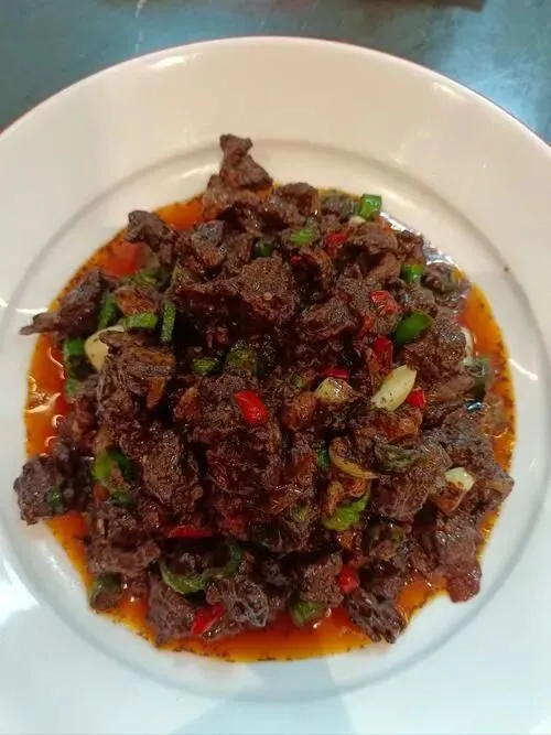 第二个是血鸭,衡阳人请客必点的硬菜。做法讲究得很,鸭子现杀,血要接住不能凝固。锅里爆香仔姜、青椒、干辣椒,鸭肉下去翻炒,炒到皮焦肉紧。最后那一勺鲜血淋上去,快速翻匀,血裹在肉上,又嫩又滑。一盘端上来,香得邻桌都探头。咬一口,姜味冲鼻,辣味打舌头,嚼起来带着韧劲,越嚼越香。配一碗白米饭,能干三碗。一份血鸭58块,够4个人吃,人均不到15块,这性价比上哪找去?