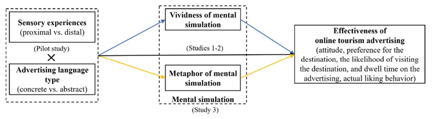 鉴于这一背景,当前研究试图回答以下问题:感官体验(近距离 vs. 远距离)与广告语言(具体 vs. 抽象)之间的交互作用是否影响在线旅游广告效果?这些关系的内在机制是什么?本研究提供了几个贡献。首先,本研究通过引入近距离-远距离感官框架推进了旅游感官研究,使得能够系统考察感官在广告说服中的特性,并为不同感官线索在旅游情境中如何独特运作提供理论洞见。其次,本研究超越了现有的广告一致性研究,这些研究侧重于外部产品或情境属性,而本研究通过将感官线索视为游客的内部因素,将广告一致性效应扩展到个体生理感知的层面。第三,本研究通过开发一个新颖的信息处理框架,说明感官-语言一致性如何塑造游客的心理模拟,从而推进了关于广告一致性效应潜在心理机制的文献。研究结果进一步为旅游营销人员设计有效的感官营销方法提供可操作的指导。