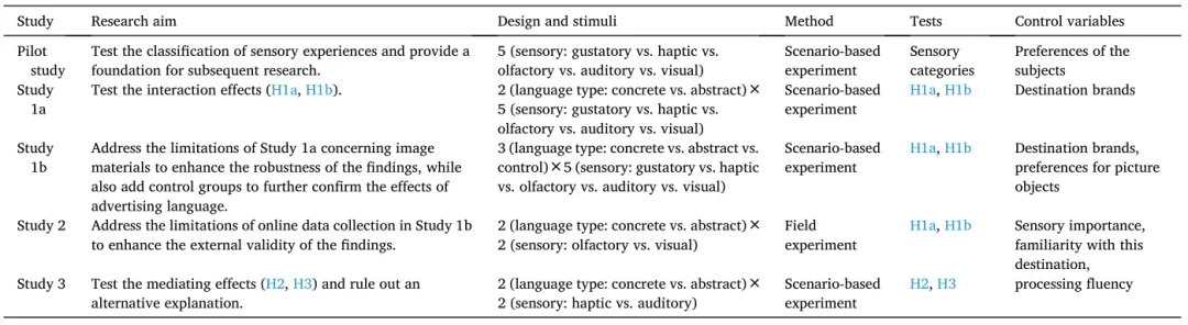 我们开发了一个理论模型并采用五项研究(一项试点研究和四项实验)来检验我们的假设。具体而言,试点研究识别了感官体验的类型及其与不同心理距离的关系。研究1a测试了感官体验与广告语言类型提升在线旅游广告效果的匹配效应。研究1b通过改变广告情境再次验证了交互作用,并通过添加对照组排除了其他干扰因素。研究2通过田野实验再次复制了这一发现,以增强外部效度并展示我们发现的实际营销意义。研究3进一步考察了心理模拟(生动性和隐喻性)对上述交互效应的中介作用,我们还排除了一个可能的替代解释。所有研究都包含注意力检查,仅报告符合标准的最终样本(详细信息请见论文附录)。