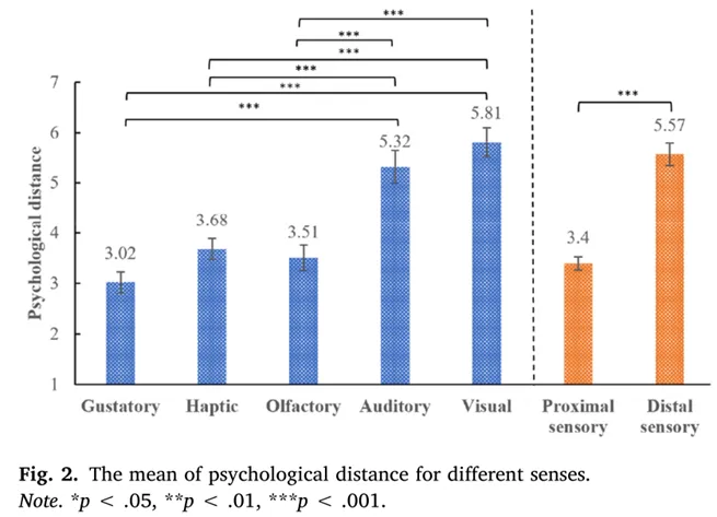 结果汇报:单因素方差分析表明感官存在显著主效应(F(4, 200) = 23.97, p < .001, ηp² = 0.322),详细结果如图2所示。事后分析表明,味觉与触觉(p = .07)、嗅觉(p = .17)没有显著差异,但与听觉(p < .001)和视觉(p < .001)有显著差异。触觉与嗅觉(p = .651)没有显著差异,但与听觉(p < .001)和视觉(p < .001)有显著差异。嗅觉与听觉(p < .001)和视觉(p < .001)显著不同。听觉与视觉(p = .160)没有显著差异。更重要的是,三组(味觉、触觉和嗅觉)的心理距离均值低于两组(听觉和视觉)(M = 3.40, SD = 1.45 vs. M = 5.57, SD = 1.85; F(1, 205) = 89.14, p < .001, ηp² = 0.298)。此外,游客对五种感官的偏好没有显著差异(F(4, 200) = 0.73, p = .571)。这些结果支持我们提出的感官体验分类。这种感官体验分类在后续研究中使用。