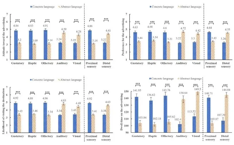 广告态度:双因素方差分析显示,感官体验类型与广告语言类型之间存在显著交互作用,对广告态度产生显著影响(F(4, 365) = 71.13, p < .001)。进一步分析表明,在近距离感官体验(味觉、触觉、嗅觉)条件下,使用具体语言的广告引发了显著更积极的广告态度;而在远距离感官体验(听觉、视觉)条件下,使用抽象语言的广告表现出更高的广告态度。将感官类型整合为近距离与远距离两类后,结果进一步显示:近距离感官体验中,具体语言显著优于抽象语言;而远距离感官体验中,抽象语言显著优于具体语言。广告偏好、访问目的地的可能性以及广告停留时间的分析结果与广告态度的模式一致,具体统计结果见原文。
