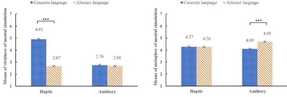 心理模拟的生动性:双因素方差分析显示,感官体验和广告语言的交互作用对心理模拟的生动性(F(1, 510) = 396.16, p < 0.001)和心理模拟的隐喻性(F(1, 510) = 14.13, p < 0.001)有显著影响。进一步分析显示,对于触觉体验,使用具体(vs. 抽象)语言产生了更高的心理模拟生动性(M具体 = 4.91, SD = 0.77 vs. M抽象= 2.67, SD = 0.48; F(1, 253) = 685.41, p < .001, ηp² = 0.730),但对于听觉体验,广告语言对心理模拟生动性的影响没有显著差异(M具体 = 2.76, SD = 0.49 vs. M抽象 = 2.68, SD = 0.55; F(1, 253) = 2.02, p = .156)。因此,近距离感官体验配合具体(vs. 抽象)语言描述将引发更高的心理模拟生动性。