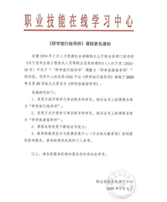 2024年7月“研学旅行指导师”正式更名为“研学旅游指导师”