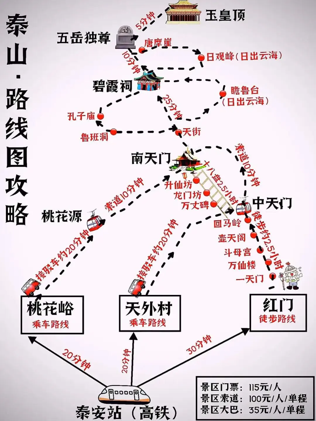 岱庙——岱宗坊——红门宫——万仙楼——斗母宫——经石峪——壶天阁——回马岭——中天门——快活三里——云步桥——五大夫松——十八盘——南天门——天街——碧霞祠——唐摩崖——五岳独尊——玉皇顶——拱北石