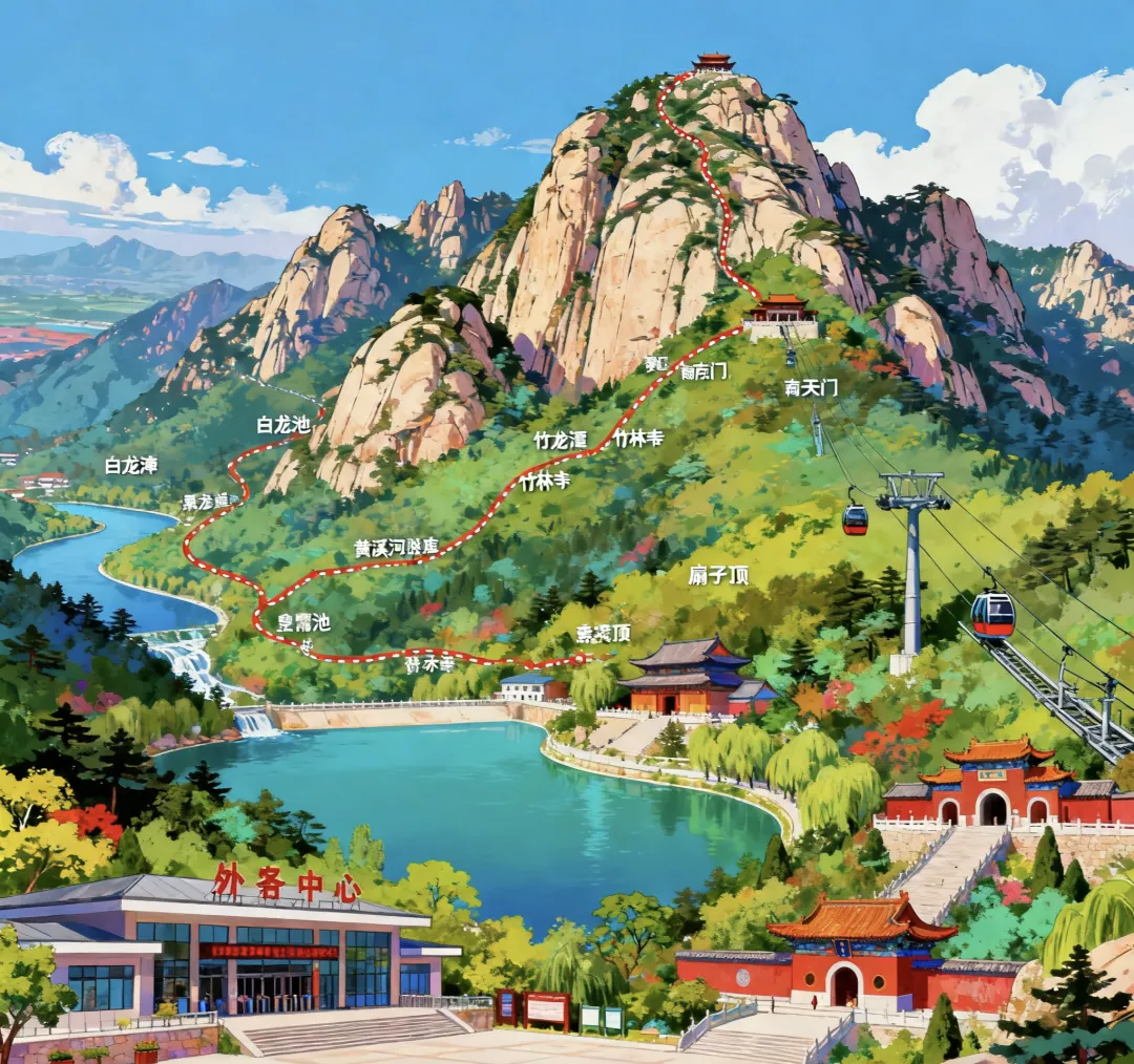 路线:天外村游客中心——龙潭水库——白龙池——黑龙潭——竹林寺——黄溪河水库——扇子崖——傲徕峰——中天门——索道——南天门——碧霞祠——玉皇顶