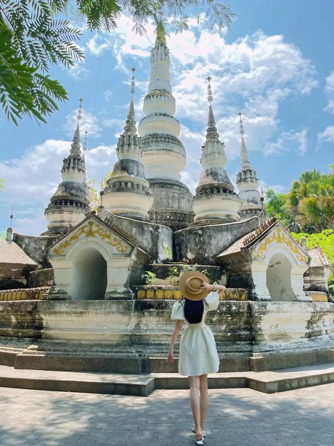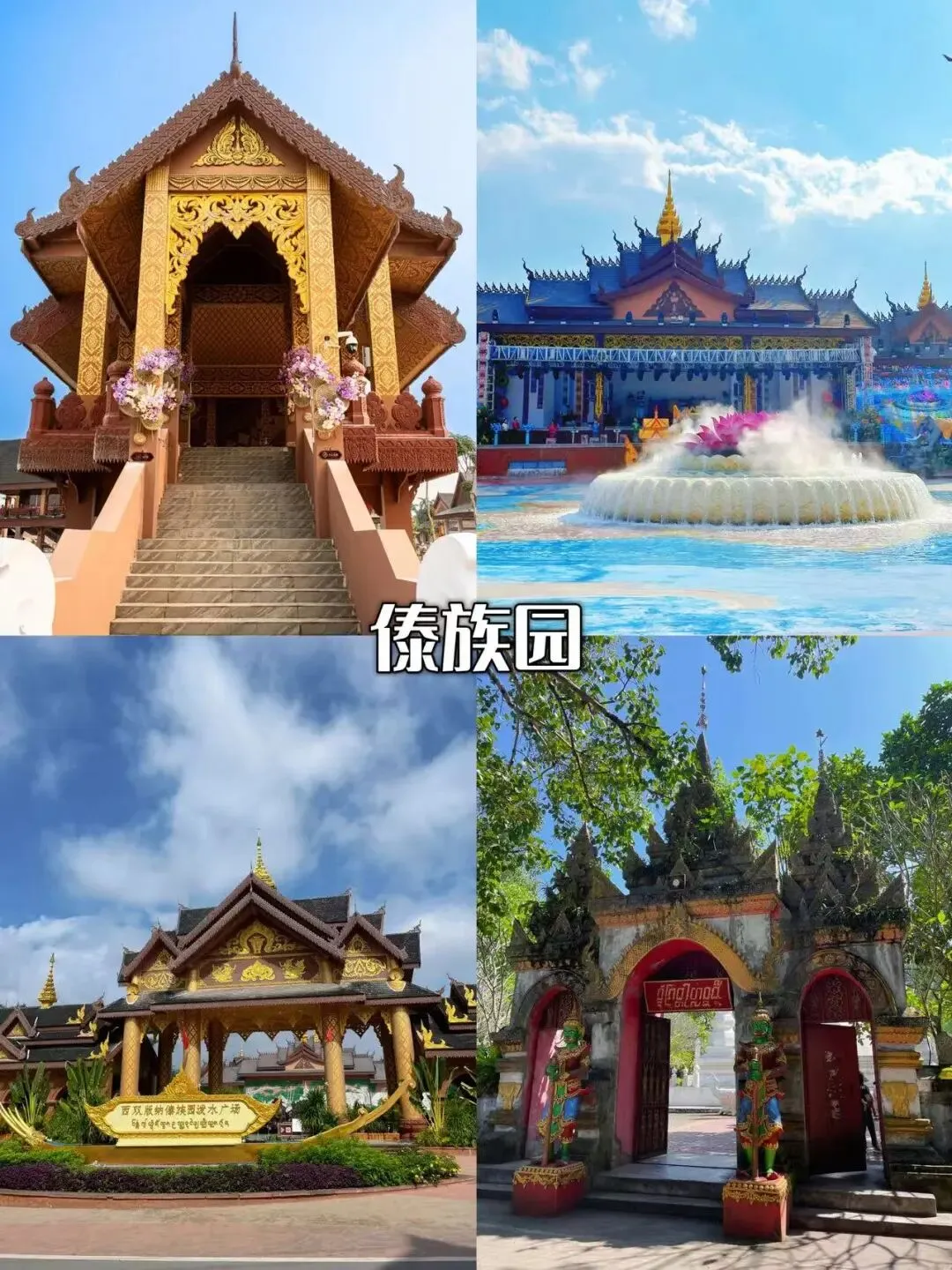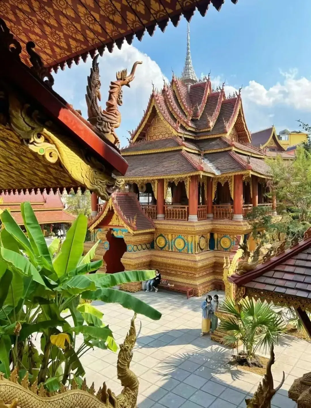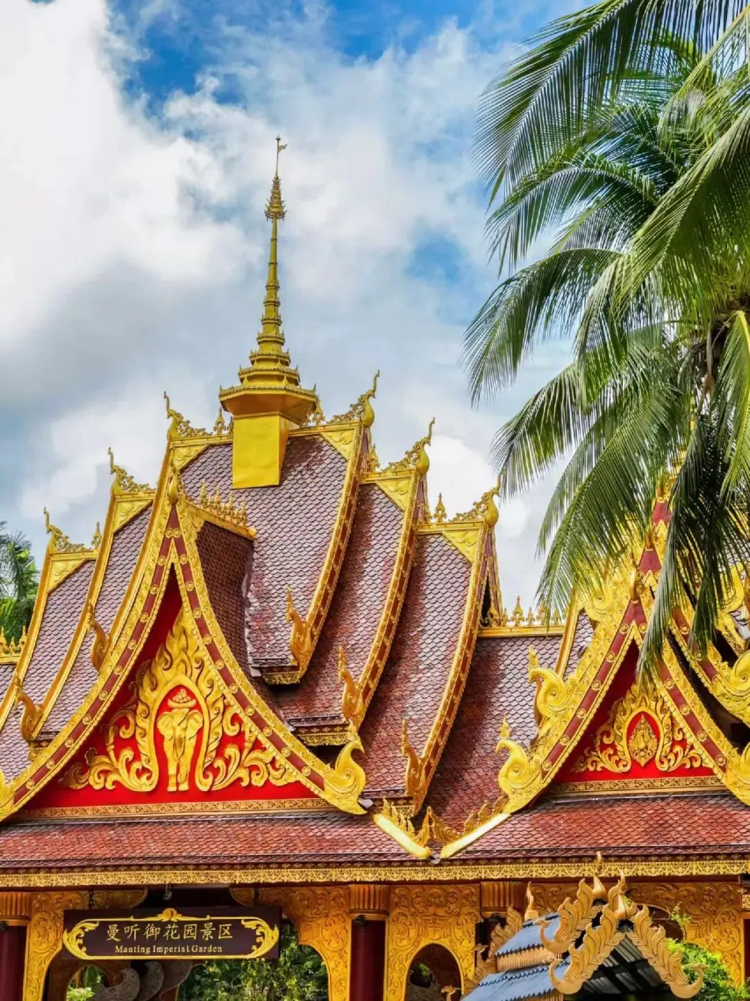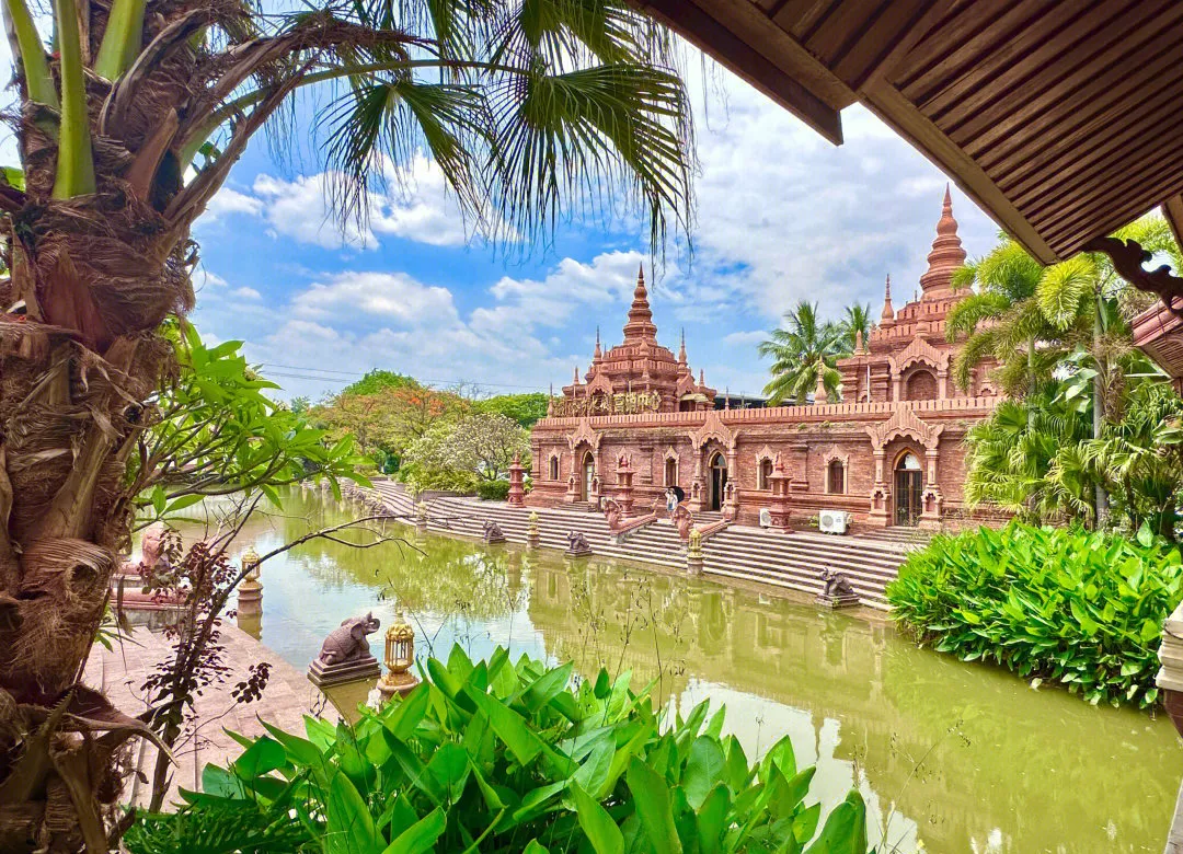 1. 上午:约个美美的傣装,10分钟车程到「曼听公园」,逛傣王御花园,红墙金顶配热带植物出片率超高!逛累了还能在湖边喂鸽子。