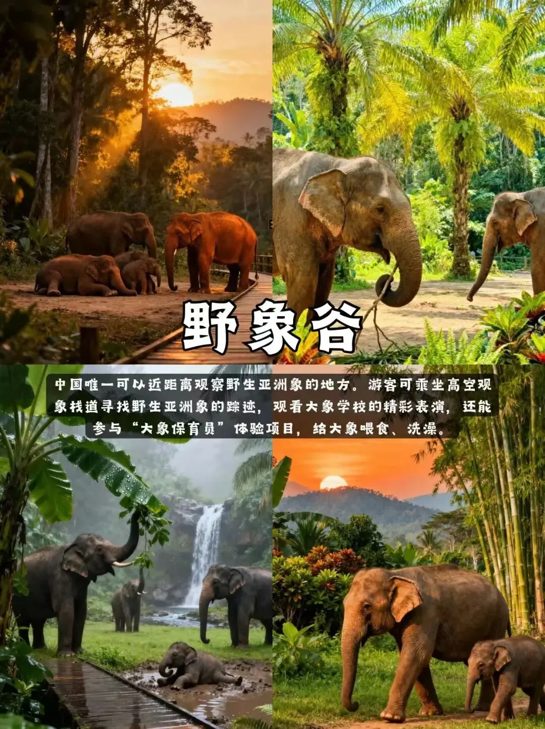 2、野象谷:中国首家以动物保护和环境保护为主题的国家公园。除了观察野生亚洲象(有一定几率),还可观看大象表演,体验雨林观光索道,了解亚洲象保护知识。