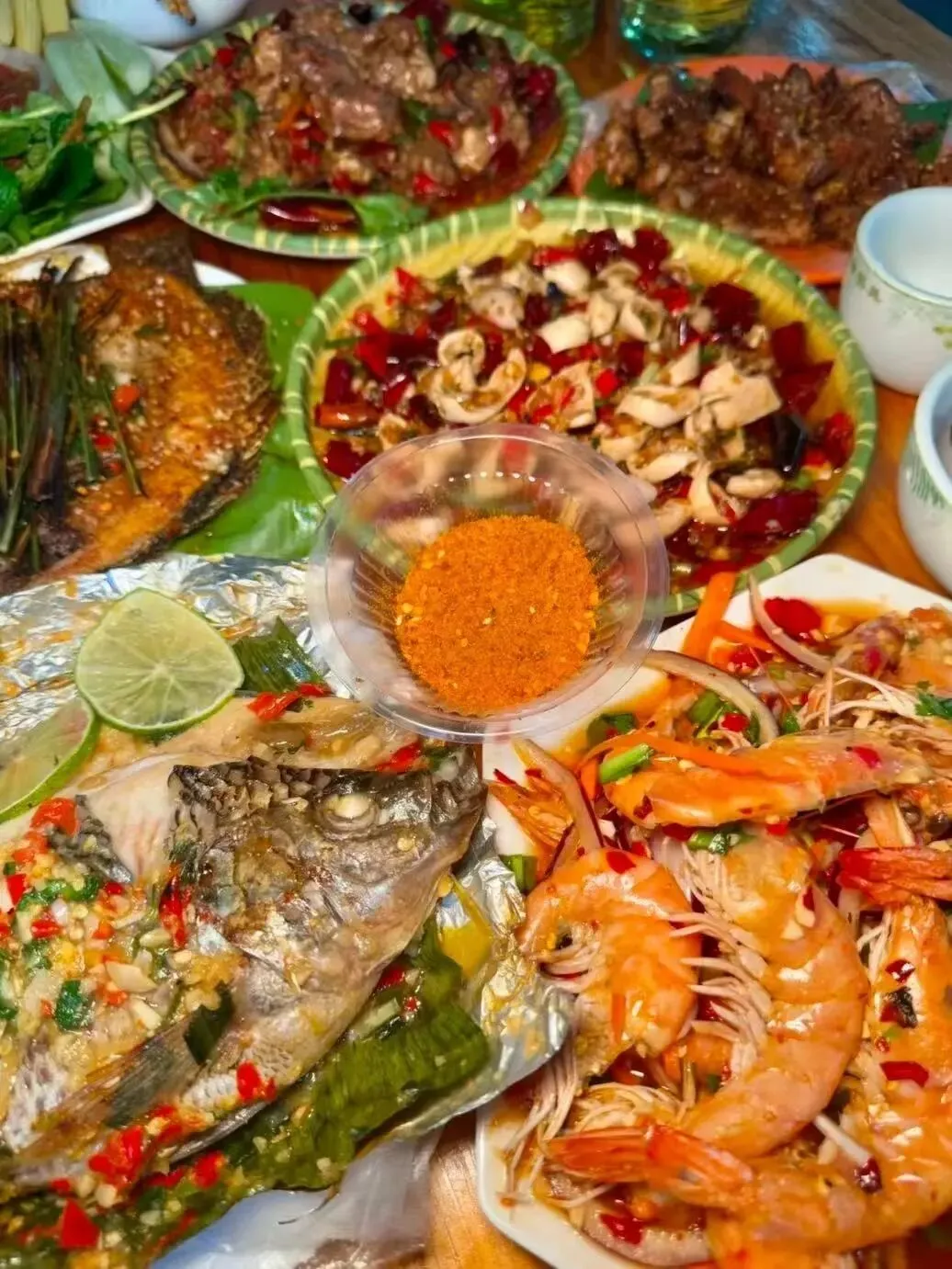 ✅香茅草烤鱼:鱼腹塞满香茅草,炭火烤到外焦里嫩,蘸上傣家特制蘸水,酸辣开胃。