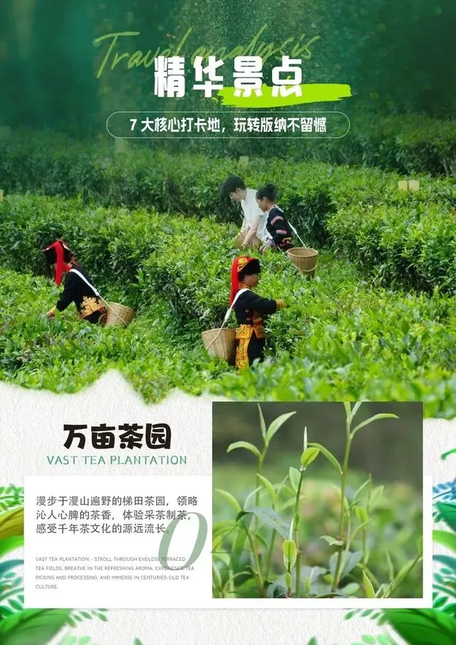 第3天: 南糯山—原始森林公园—水底世界 早餐后乘车前往游览【南糯山】或【万亩茶园】在傣语里是“笋酱”的意思,据说那是在许多年以前,有一天傣族土司到南糯山巡视,当地招待宴上的“笋酱”大受其喜爱,顺势提出每年进贡笋酱,所以村民至今仍有制笋酱的传统。而南糯山的东道主正是哈尼族,哈尼人十分勤劳,千年前就在南糯山栽种和饮用茶叶。 乘车前往游览(电瓶车60元/人,为保证行程统一请客人务必缴纳)(景区内的商业板块与旅行社无关)园内森林覆盖率超过98%,是个天然的大氧吧。气候温暖湿润,树木葱茏,蔓藤盘根错节,不少珍禽异兽,如亚洲象,犀鸟,孔雀,黑冠长臂猿都生活在这片热带丛林里。品种繁多的热带植物遮蔽日,龙树板根、独木成林、老茎生花、植物绞杀等植物奇观异景随处可见,峡谷幽深、乌鸣山涧、林木葱茂、湖水清澈,让您真切感受到大自然的神秘。爱伲寨的抢亲、泼水节的欢畅、各民族的歌舞表演,任游客亲身参与,使游客置身于浓郁的民族风情中留连忘返。孔雀开屏迎宾,猴子与人嘻戏,黑熊、蟒蛇、蜥蜴、穿山甲等珍稀动物,让您见识真正的动物王国,让游客充分感受人与自然、人与动物的和谐相融。 赠送价格120元/人湄公河水底世界、是以湄公河水生动物和热带雨林为核心打造的虚拟全景沉浸式水族馆,位于国家4A级旅游景区西双版纳原始森林公园内,占地5000多平方米。可以在中华鲟水底隧道,感受1.4亿年的生命奇迹;还有一座会飞的7D影院,带你穿越湄公河;更有以湄公河水底世界明星物种——中华鲟、水母、水獭、巨鲶、棕褶树蛙、暹罗巨鲤组成的“蓝莓六萌团”,带你走进一个原始森林深处的水底世界,体验一次湄公河精灵梦王国的奇幻之旅。(赠送项目不去不退费) 推荐参加:曼听篝火晚会280元/人自理、勐巴拉娜西篝火晚会280元自理、湄公河游船280元/人自理 用餐:早中 住宿:版纳