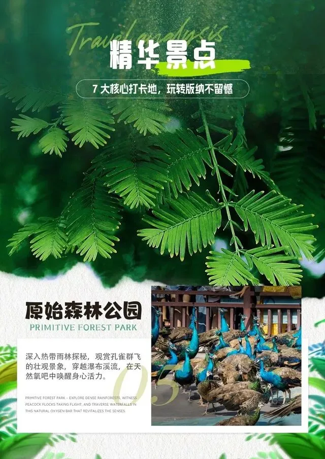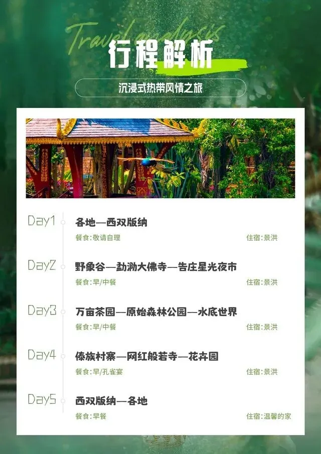 第2天:野象谷—勐泐大佛寺—告庄星光夜市 早餐后前往游览理想而神秘的热带雨林探险圣地、国家4A级景区【野象谷】(景区内的商业板块与旅行社无关)游览攻略: 第一步:穿越热带雨林,幸运的您还有机会看到壮观的野象群出没、它们时而河边嬉戏、时而踏草寻欢、高兴时还会昂起长长的鼻子唱响高亢的歌(因森林内野生动物出没受时间、天气、区域等诸多因素影响、我们不能保证您能看到这些可爱的精灵)、 第二步:参观百鸟园,百鸟园介绍:野象谷公园中有一个百鸟园,饲养着云南特有的珍稀鸟类和一些美丽的观赏鸟类。其中有:白鹇、云南原鸡、虎皮鹦鹉等。 第三步:参观蝴碟馆,蝴蝶园,还真是名符其实。走进去,扑面所见满眼皆是各色飞舞的蝴蝶。大大小小的纯色的花色的蝴蝶在花丛间枝叶上穿梭,自顾自地旁若无人地展翅敛翅;一飞一停,这儿那儿,时徐时急,轻轻柔柔,万千姿态,令人目不暇接。 第四步:参观蟒蛇园 第五步:大象表演升级为大象科普园,同样可以看到大象,依然有场次,还是半小时活动,只是节目的内容和形式有所改变。场内展示大象的自然行为,同时引导观众观察大象的行为活动。给观众介绍大象的生活习性,身体特点。进行大象体检、大象的觅食行为观察等等。 后乘车游览参观西双版纳傣王的皇家寺院——【勐泐大佛寺】(电瓶车40元/人,为保证行程统一请客人务必缴纳)(尊享VIP通道,不排队零等候)(景区内的商业板块与旅行社无关),佛寺 是在古代傣王朝的皇家寺院“景飘佛寺 ”的原址上修建的,以佛祖释迦牟尼的生平及佛 寺活动为主线,九龙浴佛、景飘大殿、神石、国殿、吉祥大佛等有 500 多座佛寺、200 多座佛塔。而勐泐大佛寺是所有佛寺中最大的,地位也是是至高无上的,是傣家人心目 中的圣地,成为世界南传佛教的文化中心。今日独家资源特别安排:《神石祈福》据贝 叶经记载,这块大石出现在一个雷电交加,风雨大作,大地震动的夜晚,而附近村寨的 居民一直把它当作天降神石祭拜。在第二年,佛祖坐在此石上休憩为四处赶来的百姓讲 经说法。佛祖指着当时澜沧江和流沙河泛滥的坝子,留下预言:将会有一个帕雅(傣王) 管理并繁荣这个地方,佛法将在这里从此光大昌盛……根据时间可观千只孔雀放飞盛 景。参与傣家泼水活动祈福“泼湿一身,幸福终身 ”。 后赠送【告庄西双景傣装换装秀】,今晚将穿上版纳少数民族傣族服饰,感受民族特色美,做一回唯美傣家人,去逛亚洲最大的星光夜市,喜欢拍照的朋友,请尽情的自拍吧,把最美的自己在版纳留下印记。(傣族服饰在3小时之内归还即可,超时按照20元/小时计费,不足1小时按照1小时计算,不含拍照,赠送项目不去费用不退)。晚上可自行前往夜游告庄【星光夜市】(景区内的商业板块与旅行社无关),星光夜市及赶摆夜市所构成的大金三 角最具特色、最具规模夜市集群,更有景区内每年举办的大型民俗活动,全年欢乐不打烊,绝对给你一个超乎想象的、 梦幻般的西双版纳!告庄西双景 ,充满了东南亚异域风情的休闲娱乐 , 网红打卡地【六国水上集市】、赶摆场、东南亚美食岛、游船码头等 ,来此的体验都是冠绝全国 ,是西双版纳澜沧江畔最美的风景线。(由于游玩时间无法统一, 游客游玩结束后自行返回酒店) 用餐:早中 住宿:版纳