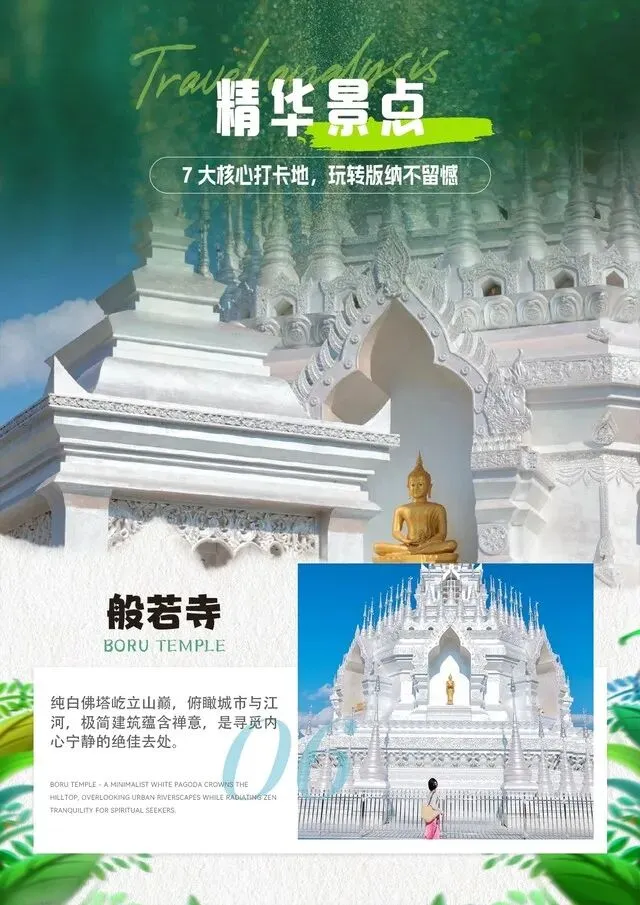 第4天: 傣族村寨—网红般若寺—花卉园 早餐后前往【傣家文化村寨】(景区内的商业板块与旅行社无关)漫步在热带雨林怀抱中的傣家村寨、你会发现、四周翠竹围绕、绿树成荫、这就是最真实、最质朴的西双版纳、原始民族村寨的独有风情、静静的传承了数千年。 早餐后前往西双版纳网红打卡地【般若寺】(景区内的商业板块与旅行社无关)因为是华丽的建筑风格走红网络。这是一座结合了傣族传统建筑风格与东南亚风情的南传佛教寺庙。寺庙建筑充满了浓郁的异域色彩,靠立山顶,似一座遗落人间的琼楼玉宇距今已1200多年的历史了,“般若”是梵文praina的音译,意即“智慧”。印度语系中含清净无为、智慧深广之意,佛教用来指如实了解一切事物的智慧。般若寺通体银白,殿前一颗高大的椰子树为这座傣族佛寺增添了一份热带风情,寺庙是典型的南传风格配合了傣族传统的建筑布局,中央是高耸如云的圆型塔尖四周塔林围绕,内部供奉金身佛,佛塔四边为四座守护神坐像。浑然一体!乳白色的佛塔,庄严神圣,在蓝天白云的映衬下,显得格外宁静。来往这里朝拜或者拍照的人都很安静平和。入住酒店 早餐后乘车前往【热带花卉园】(电瓶车40元/人,为保证行程统一请客人务必缴纳)(景区内的商业板块与旅行社无关)主要体现了热带植物花卉、热带橡胶和热带水果及周总理纪念碑群文物区四大主题。目前开放的景点有叶子花园、稀树草坪区、周总理纪念碑、热带棕榈区、空中花园、观鱼、热带水果种质园、五树六花园、科技陈列馆、巴西橡胶种质资源库等景点。在园中,可以看到叶如簸箕大的王莲,形如鞭炮的炮仗花,似鸟儿飞翔的天堂鸟,叶似花花是叶的三角梅,像蛋黄色的鸡蛋花,有会跳舞的跳舞草,会含羞的树和含羞的草,会下雨的雨树,使口感变味的神秘果等热带奇花奇树;可以参观科技陈列馆了解橡胶树种植历史和发展前景及它与人民的日常生活有何种关联?可以通过现场割胶演示,来亲身体验如牛奶般的胶乳是如何流淌出来的;可以通过视察碑、会晤碑等纪念碑群了解敬爱的周总理对热作所科研人员的关怀及与缅甸吴努总理友好会晤的情形;还可以认识丰富的热带特有水果,享受那天然甜美的滋味。 用餐:早中 住宿:版纳