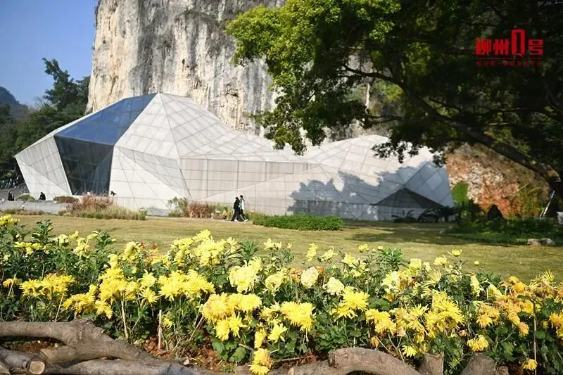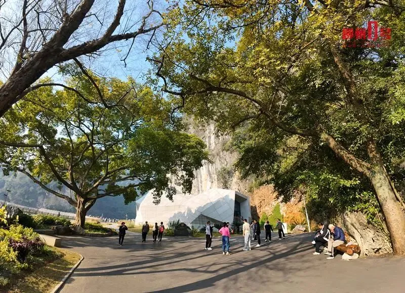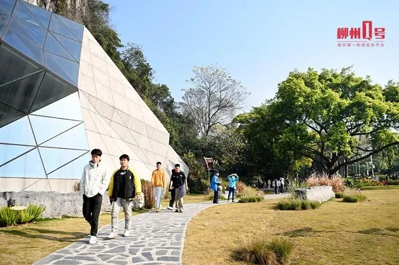 1月13日,位于龙潭公园的柳州鲤鱼嘴遗址展示保护馆前的大草坪前人来人往,游客沿着草坪内新修的小径缓步穿行,欣赏沿路的观赏花草。草坪旁的小叶榕下,市民围在一起接力踢毽子,累了便坐在生态座椅上休憩。