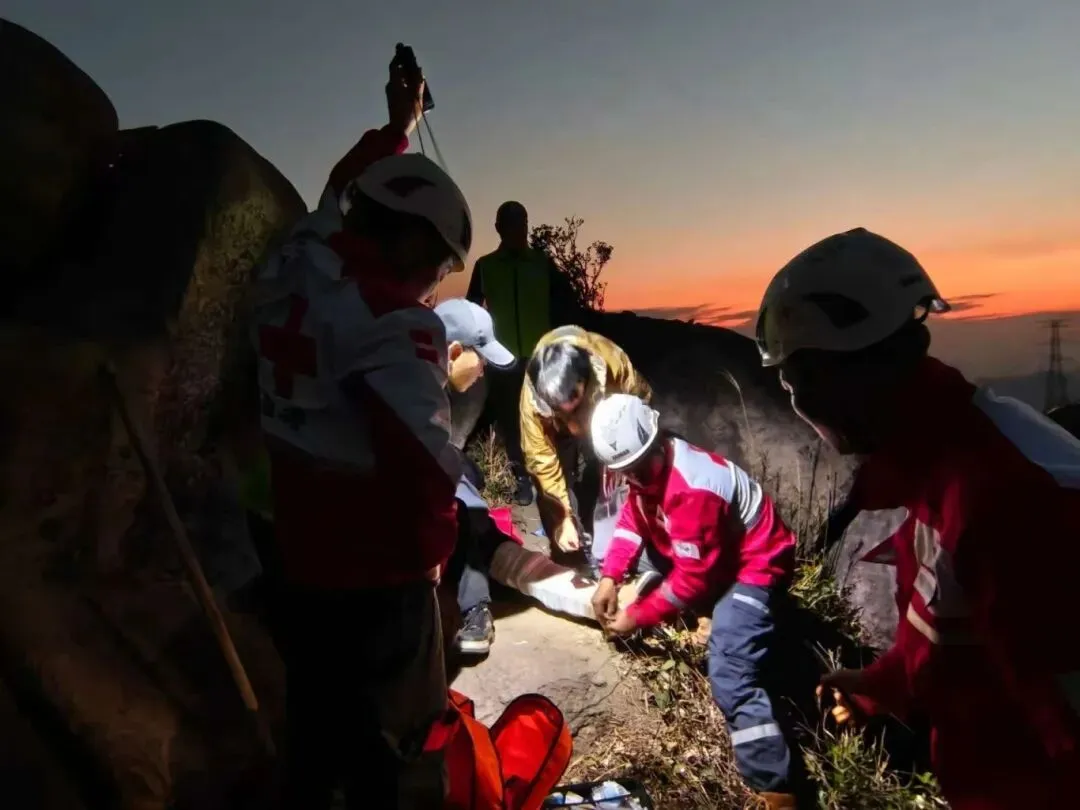 “20多分钟后队员到达现场时,天色已微暗,山上其他群众正陆续下山,伤者身旁有三位同伴陪伴着他。”救援队负责人林峰回忆。经询问得知,伤者在下山时脚卡石缝摔倒,当即无法动弹。队员初步检查判断,伤者腿部为严重骨折。