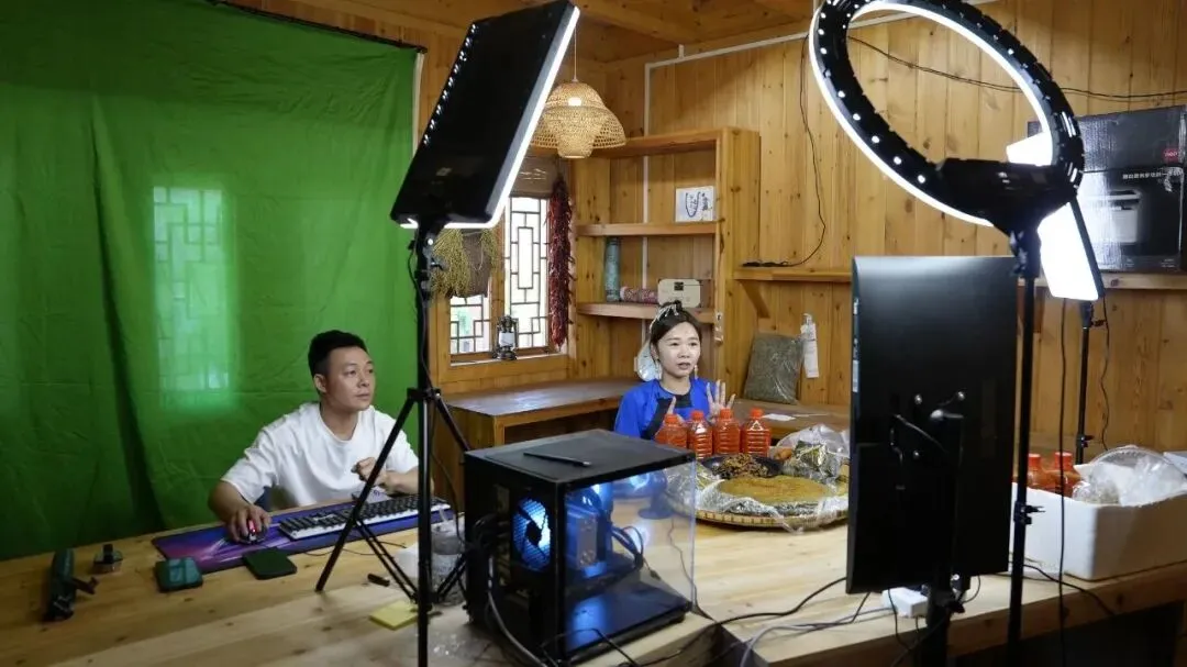 榕江一直播团队通过线上平台向广大网友展示当地的干香牛肉、酸辣椒、三月粑、粽子等特色美食。榕江融媒供图
