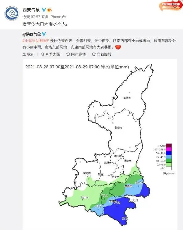 8月30日:全省阴天大部有小雨,延安南部、关中、陕南有中到大雨,渭南南部局地、汉中东南部局地、商洛北部局地、安康北部局地有暴雨。