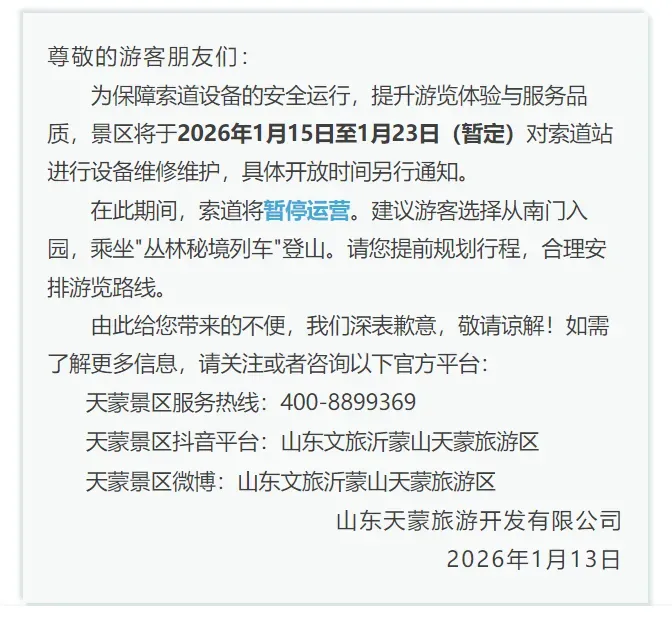 【山东头条】山东一景区索道暂停运营的公告