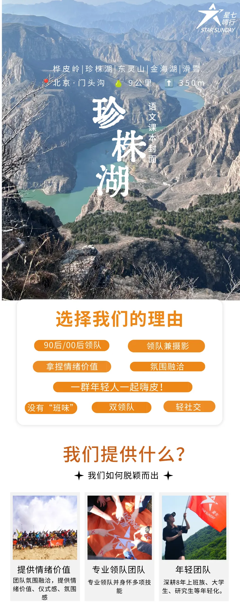 08:00 按指定集合点出发09:30 抵达徒步起点,领队带领进山 环线全程约8公里,爬升适中;沿途俯瞰珍珠湖全景(人称“京西小三峡”),可偶遇火车穿越亚洲首座铁路桥,解锁工业与自然碰撞美景16:00 集合返程18:30 抵达出发地,行程结束* 行程时间及顺序仅供参考,可能因天气、交通、景区调控、队员体能等调整,以领队实际安排为准