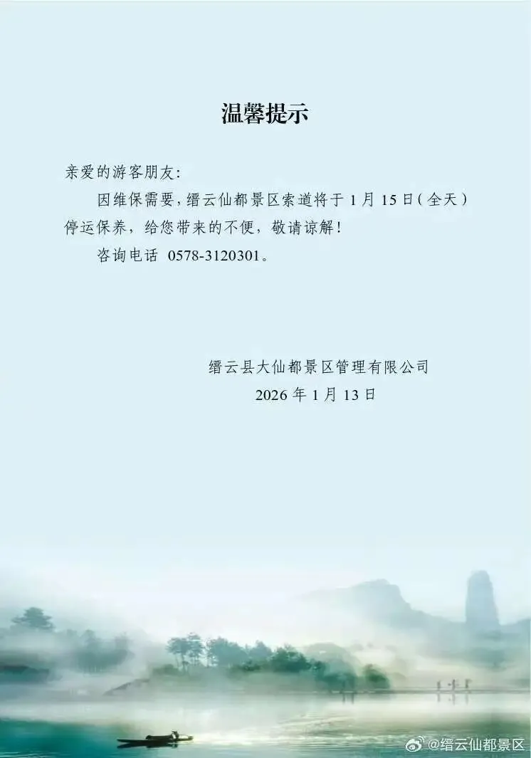您现在的位置是:首页 > 国内旅游目的推荐 > 正文 国内旅游目的推荐 1月15日,缙云仙都景区索道将停运保养! admin2026年01月14日 15:56:07国内旅游目的推荐13 1月15日,缙云仙都景区索道将停运保养!▨来源:缙云文旅▨版权归原作者所有,如有侵权请联系! 转载请说明来源于"旅荐网",部分内容转载自网络,如有侵权请联系qlwl@foxmail.com删除 本文地址:https://www.15386.cn/post/81828.html 上一篇 最新!网红景点“望郎归”封闭 下一篇 广西崇左必打卡景点新手闭眼冲不踩雷!! 相关文章 2026五一旅行指南 三亚旅游跟团纯玩无购物的路线规划,五一经典路线+费用透明攻略 广州旅游攻略(纯干货版)之一:交通和住宿篇 温湛滨研究部署滨海旅游路规划建设工作 并到现场调研 关于举办2026年第二十届全国大学生文化旅游与会展竞赛(原全国高校商业精英挑战赛文旅与会展创新创业实践竞赛)新疆赛区的通知 1小时直达!西安→宝鸡五一反向旅游攻略! 用AI帮你做旅行攻略,比小红书靠谱10倍 桂林旅游计划 人均700️桂林阳朔旅游攻略(超详细) 全城寻光 | 旅行故事*在地摄影师招募计划,无门槛,只认好作品 发表评论 取消回复 评论列表 这篇文章还没有收到评论,赶紧来抢沙发吧~