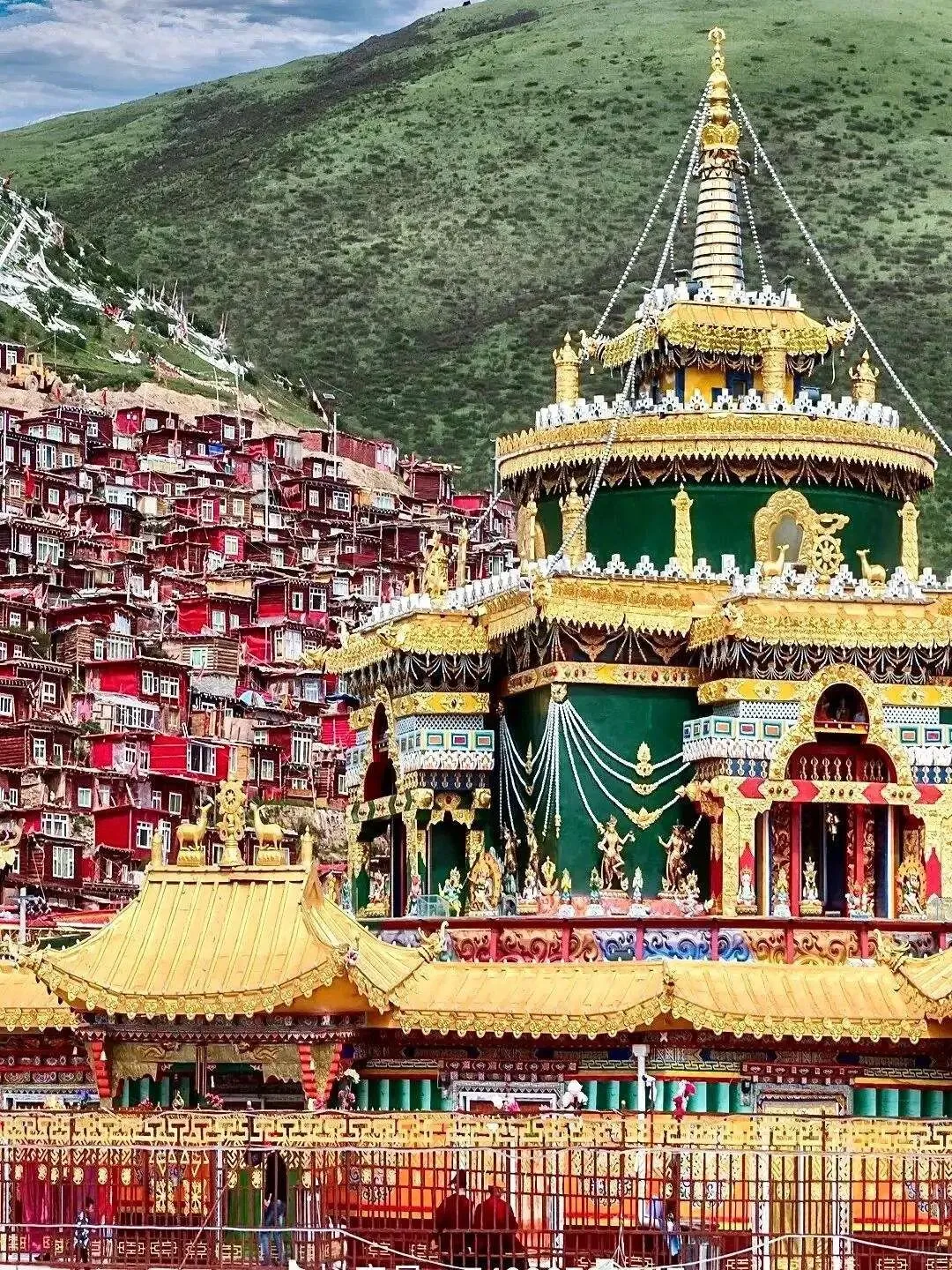 满山的红房子.,密密.麻麻像火柴盒.。傍晚,.僧侣的绛红.色僧袍.在土路上扬.起细细的.尘。坛城转.经筒的声音,混着风声,.能听到心里去。