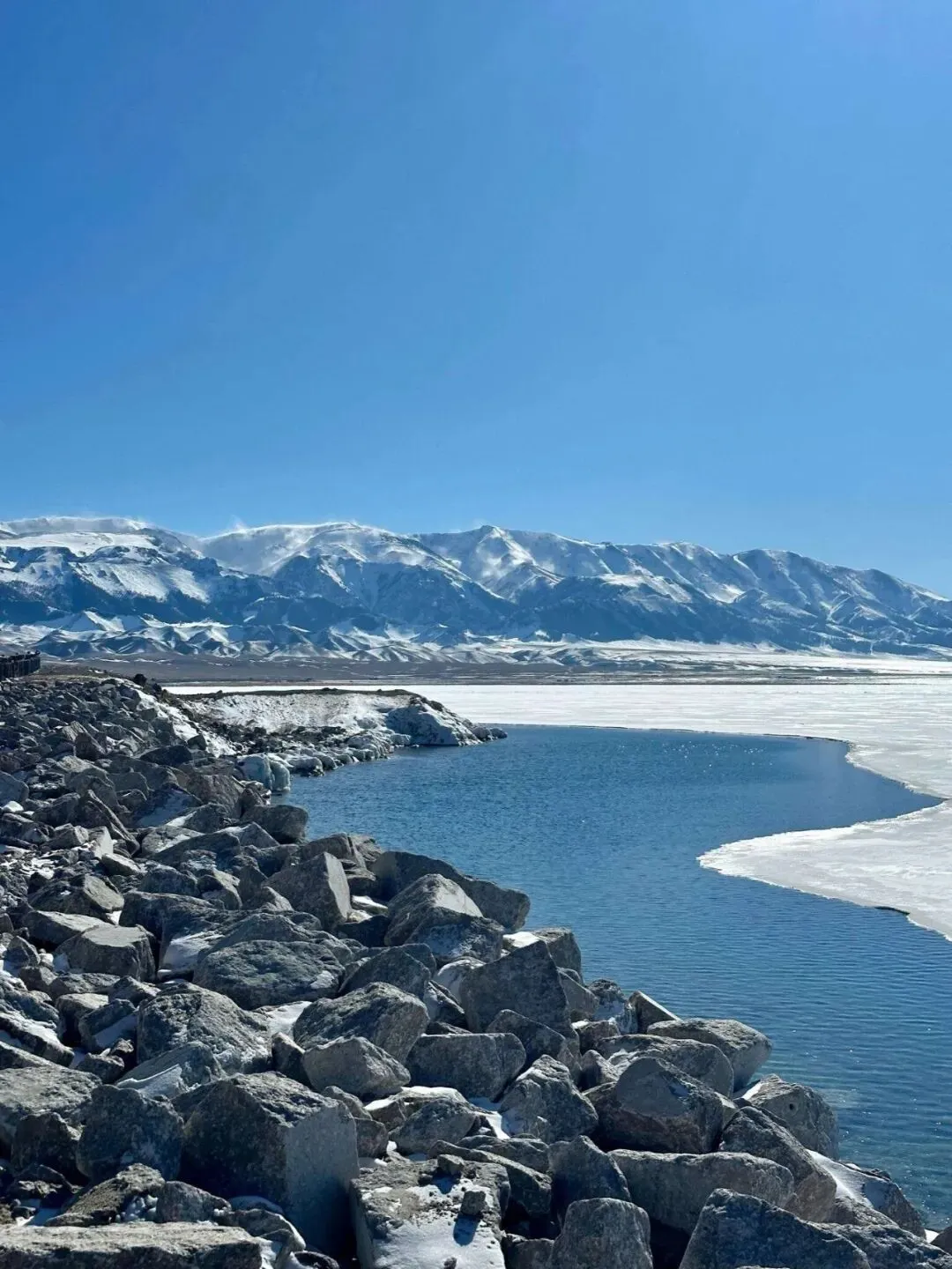 车翻过最后一个坡,.蓝得像假.的湖“砰”一下怼在.眼前。风大,吹得人.站不稳,湖边碎冰被推得哗啦响。尝了一口湖水,真是冷的,带.点咸。