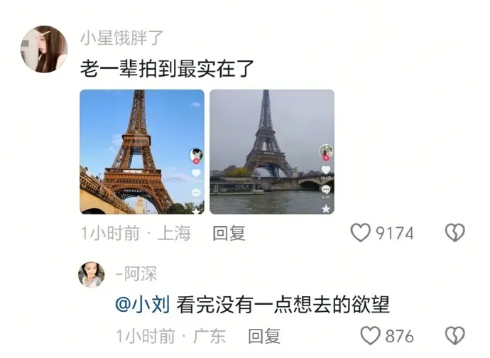 有网友在评论区解释,好天气和灯光都会为巴黎加分;也有网友认为,潮湿清冷、游客不多的巴黎,也是它真实的一面。