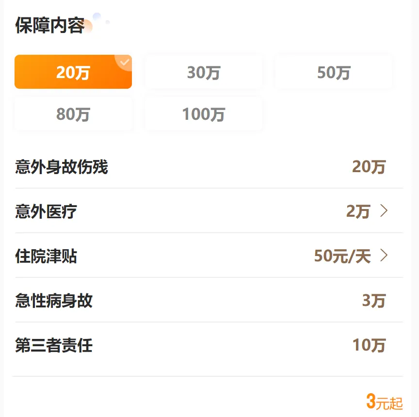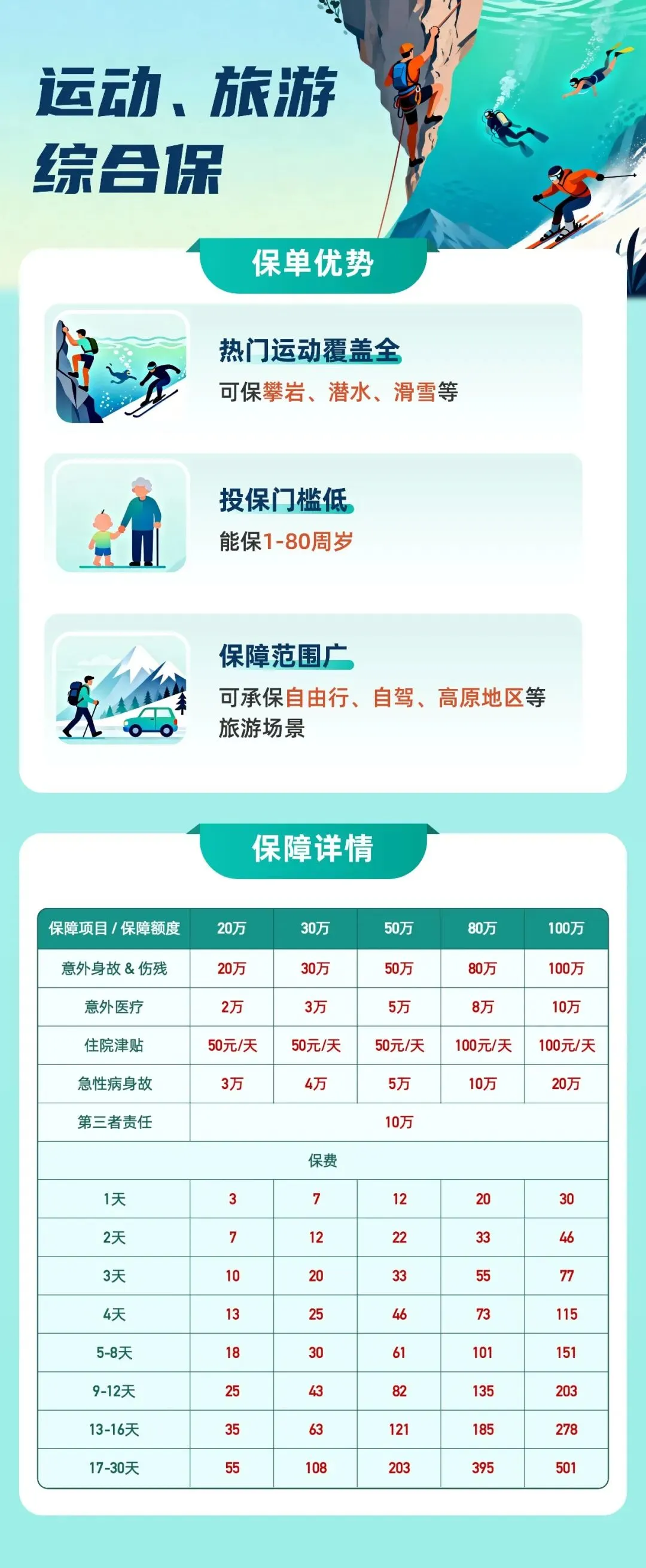 平安运动、旅游综合保:3元起,最高100万保障;承保1-80周岁;保第三者责任;核保后10分钟生效