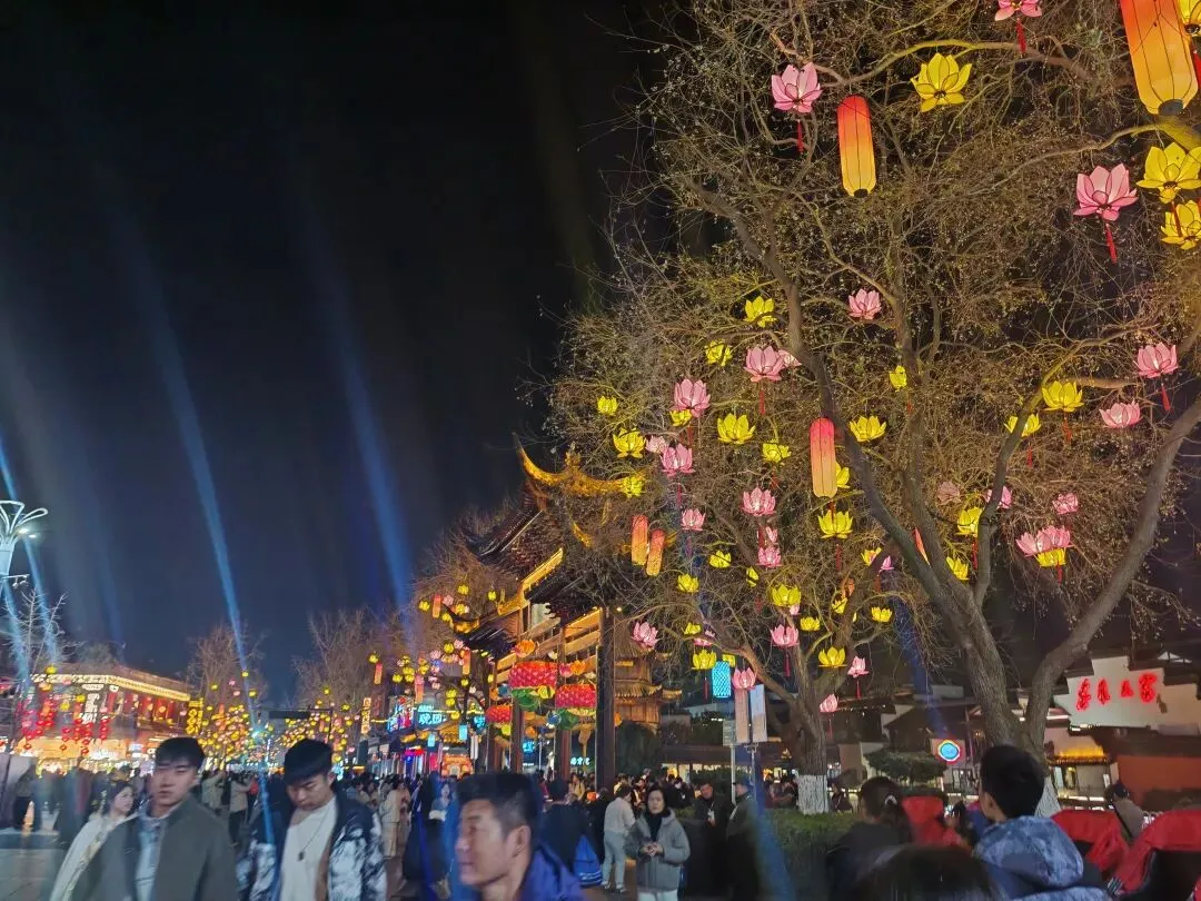 南京市中心的“亮点”景区!此处,精准诠释了“一夜鱼龙舞”! 南京夫子庙灯会一如从前,让很多前来观赏的游客眼前一亮。尤其今年的夫子庙灯会,真的是颜色俱佳,唯美飘逸。无论从灯光效果、颜色搭配,还是形态神韵,都颇有美感。 特别是一上树的满满的荷花灯笼🏮,宛若两条灯光线路一直延伸到街道的尽头。