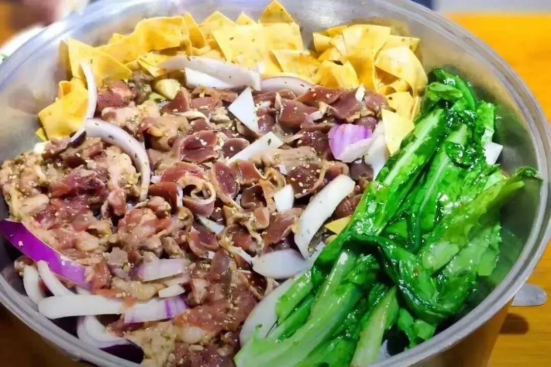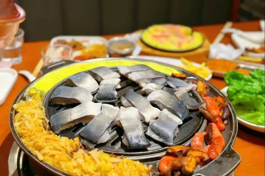 受朝鲜族饮食文化影响深远,肉类多经特制酱料腌制,烤好后配以新鲜生菜、蒜片、青椒与特色酱料包裹食用,风味醇厚,独具特色,体现梅河生活的多元融合。