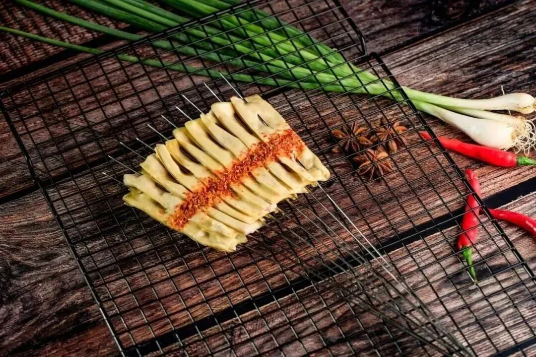 将干豆腐串成紧实的小串,置于炭火之上慢烤,反复刷上酱料。烤后柔韧耐嚼,酱香入味,是烧烤中不可或缺的特色之选,简单中见真味的梅河生活哲学。