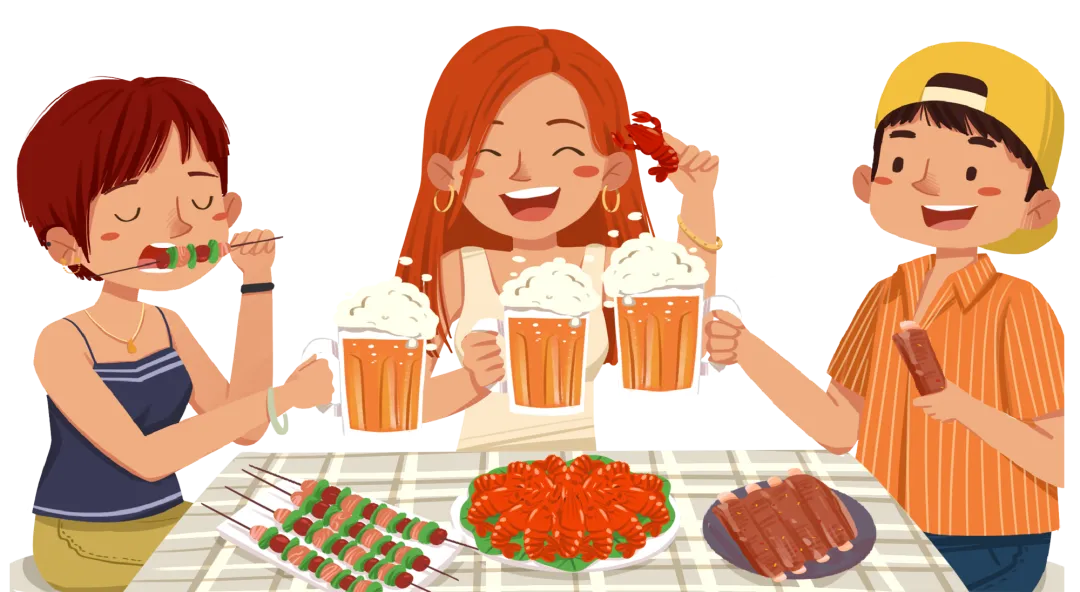 将牛羊肉切至小巧方块,快速腌制后穿成小串,置于猛火上快速翻转烤制。肉质鲜嫩,焦香四溢,味道香浓,是绝佳的下酒小食,朋友小聚的梅河生活片段。