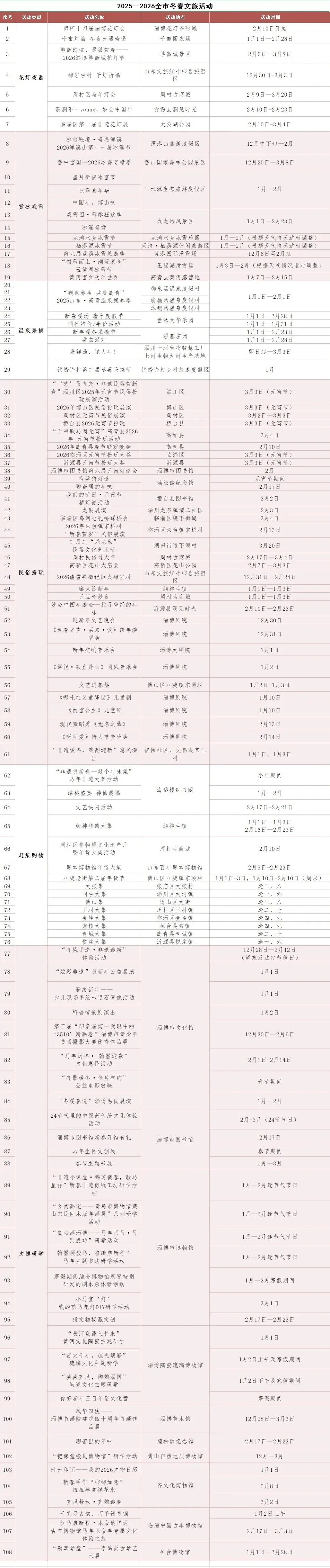 1月13日,记者从淄博市文化和旅游局获悉,2026年冬春文旅系列活动已全面启幕,部分活动将持续至3月份。淄博精心推出花灯夜游、赏冰戏雪、温泉采摘、民俗扮玩、赶集购物、文博研学6大文旅主题活动,为市民游客打造暖冬文旅新坐标。