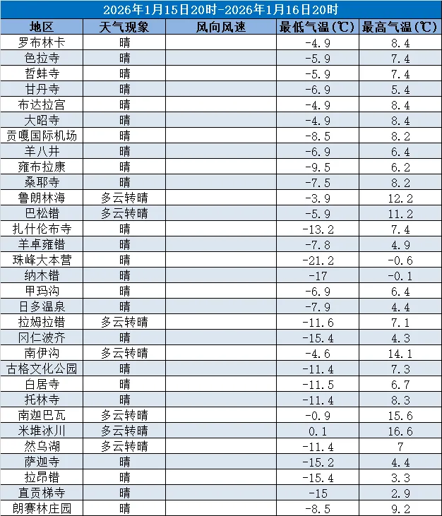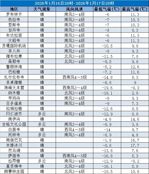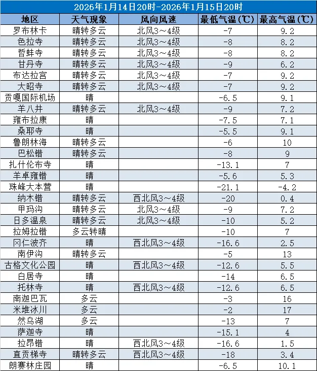 西藏大部分景区以晴转多云为主,拉萨市区及周边(罗布林卡、色拉寺、哲蚌寺等)晴转多云,东部景区如鲁朗林海、巴松错、南迦巴瓦等景区为多云,羊卓雍错、珠峰大本营、冈仁波齐等景区为晴。气温整体偏低,最低气温介于-21.1℃(珠峰大本营)至-2℃(米堆冰川),最高气温在-4.2℃(珠峰大本营)至17℃(米堆冰川)。中西部及北部地区有北风3~4级,局地(冈仁波齐、纳木错)为西北风3~4级。