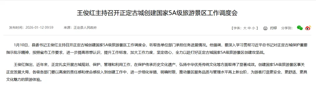 咱们看看未来哪几个景区,最有希望晋升5A级景区呢。 前几天,正定召开了正定古城创建国家5A级旅游景区工作调度会,会上强调要高度重视创建工作,对标创建标准,完善梳理创建规划,举全县之力创建正定古城国家5A级旅游景区。