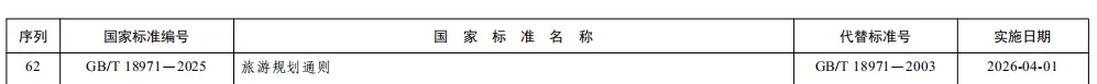 近日,国家市场监督管理总局(国家标准化管理委员会)批准发布360项推荐性国家标准。由全国旅游标准化技术委员会归口及执行的国家标准《旅游规划通则》(GB/T 18971-2025)位列其中,将于2026年4月1日起实施。